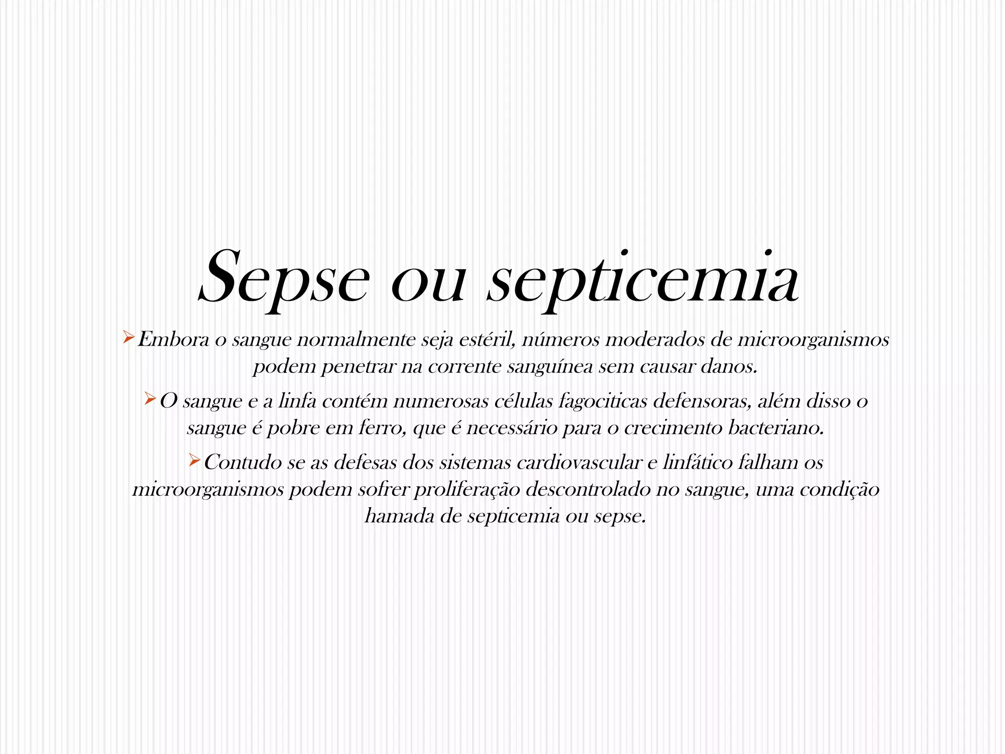 Sepse ou septicemia é uma condição em que bactérias se multiplicam rapidamente no sangue, podendo causar choque séptico e risco de morte. Pode ser causada por bactérias gram-positivas como Staphylococcus aureus ou gram-negativas como Pseudomonas e Enterobacteriaceae. O diagnóstico é feito por exames de sangue e tratamento envolve antibióticos de amplo espectro e medidas de suporte para manter a pressão sanguínea.
