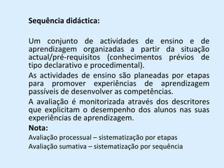Uma sequência didática é um conjunto de atividades de ensino e aprendizagem organizadas em etapas para desenvolver competências de forma integrada. As atividades são planejadas considerando os conhecimentos prévios dos alunos e avaliadas com base em descritores de desempenho. Cada etapa consolida conhecimentos para apoiar as aprendizagens nas etapas seguintes.