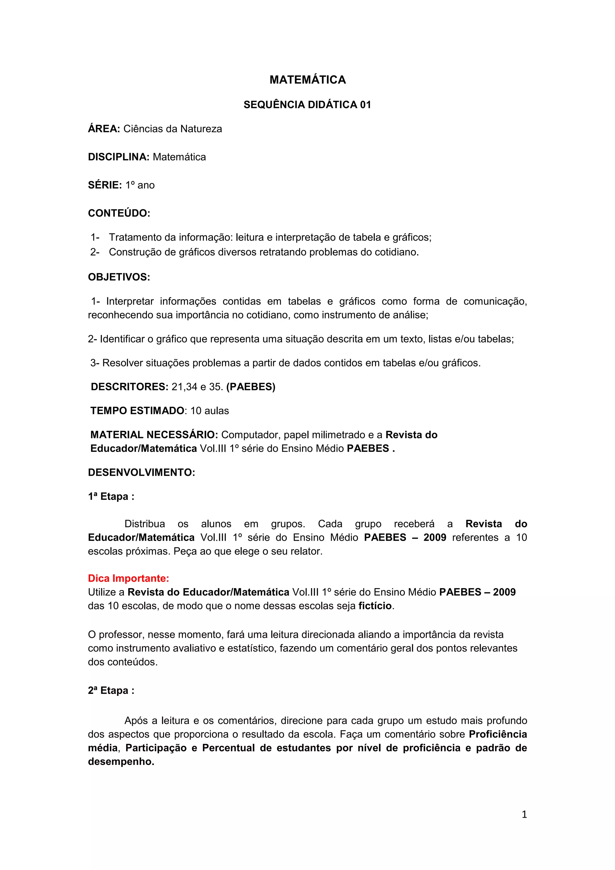 1. O documento apresenta três sequências didáticas para o ensino de matemática na 1a série do ensino fundamental, abordando os temas de tratamento de informações em tabelas e gráficos, coordenadas cartesianas e números reais.