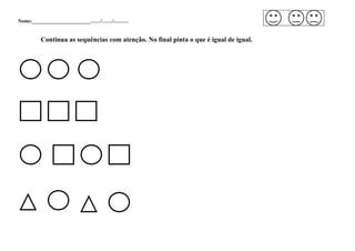 O documento pede para preencher o nome, data e continuar sequências com atenção. No final, marcar o que é igual.