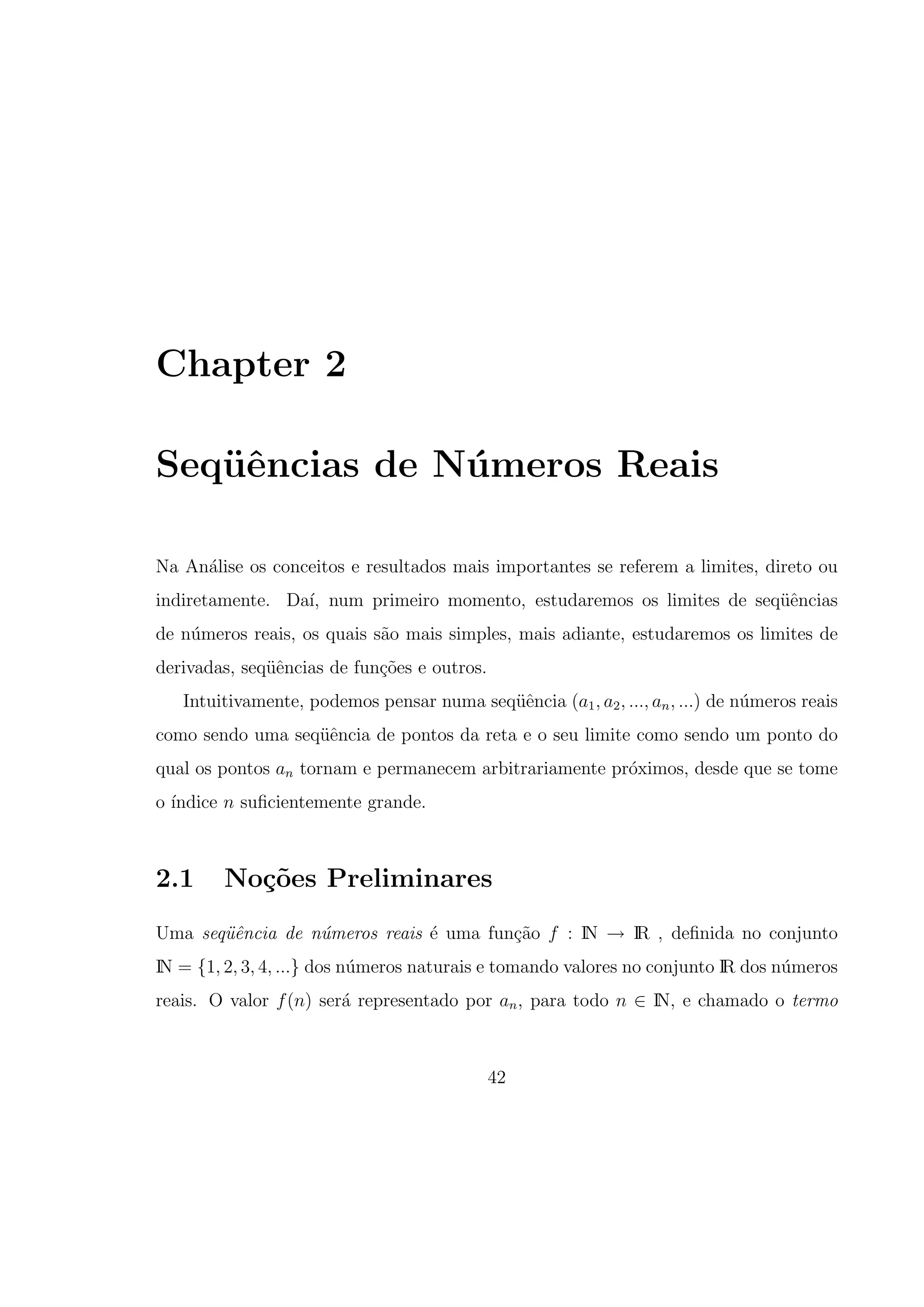 Este capítulo apresenta conceitos preliminares sobre sequências de números reais, incluindo definições de limites de sequências, convergência, monotonia e limitação. É introduzida a noção formal de limite de uma sequência e apresentados exemplos ilustrativos.