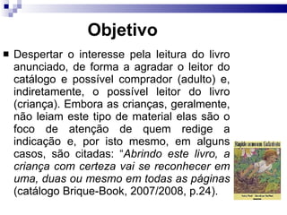 O documento descreve o gênero indicação literária, seu objetivo de despertar o interesse pela leitura sem revelar o desfecho da história. Também apresenta características como o uso de adjetivos para qualificar o livro, ilustrações e personagens, e como podem ser iniciadas e finalizadas. Por fim, sugere uma sequência didática para trabalhar este gênero em sala de aula.