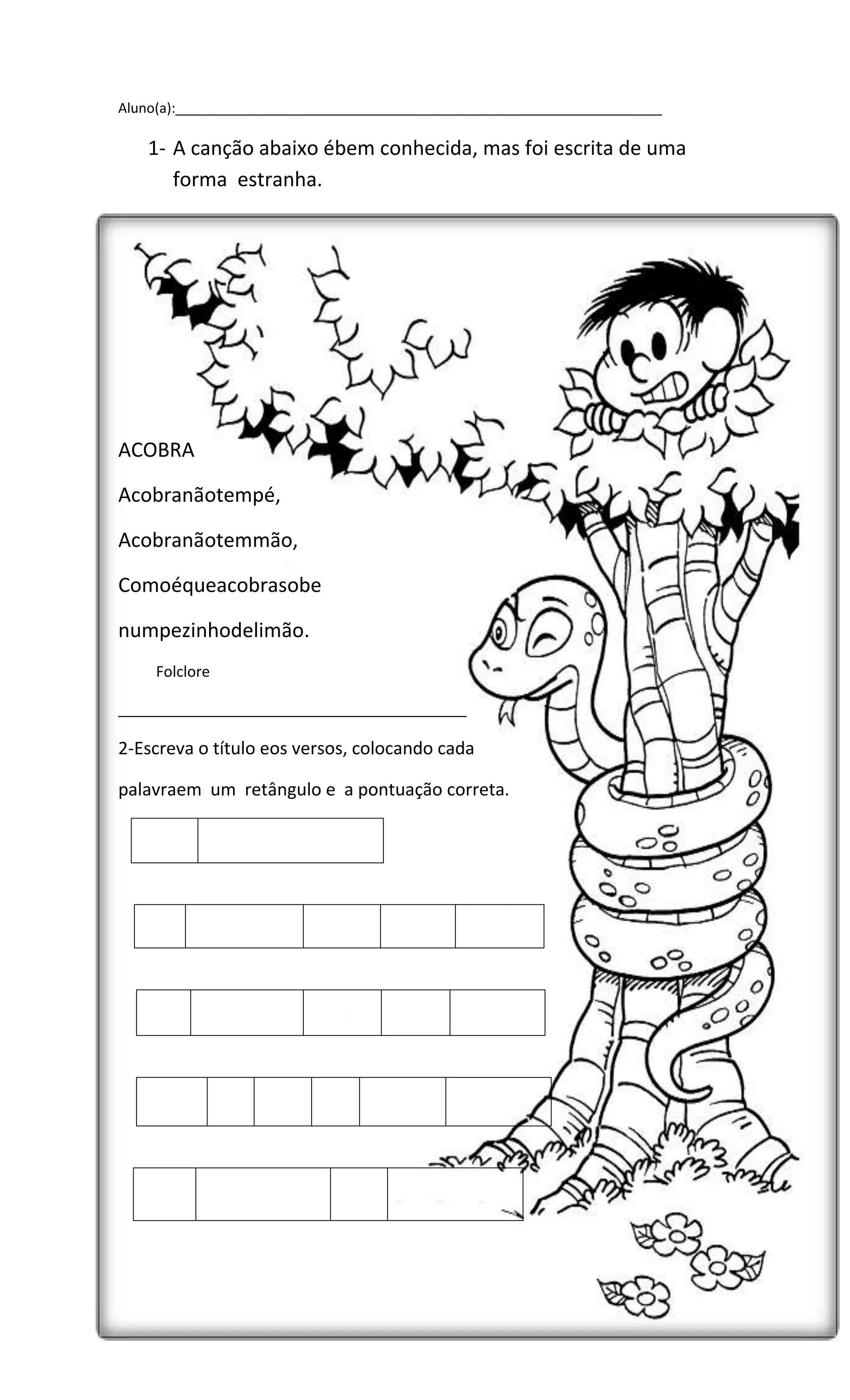 O documento contém um poema estranho sobre uma cobra subindo em um pé de limão. Ele pede para identificar palavras-chave no poema como o nome do animal e a palavra que não rima. Também contém exercícios de identificação de palavras e desenho.