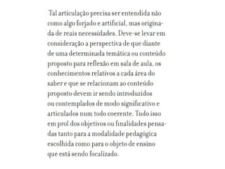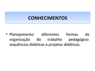 O documento discute formas de organizar o trabalho pedagógico em projetos e sequências didáticas no ensino fundamental. Apresenta as semelhanças e diferenças entre projetos didáticos e sequências didáticas, sendo que os projetos envolvem atividades em torno de um problema e os resultados, enquanto as sequências se concentram em ensinar conteúdos específicos de forma sistemática. Ambos permitem a integração interdisciplinar, contribuindo para a aprendizagem significativa dos estudantes.