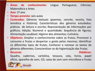 Este documento apresenta uma sequência didática de seis aulas para o 1o ano sobre alimentos saudáveis e frutas. Os objetivos são ampliar o conhecimento sobre frutas, promover seu consumo e despertar o gosto por elas. As atividades incluem poesia, lista de frutas, pesquisa, cartazes, jogos e uma exposição final sobre frutas.