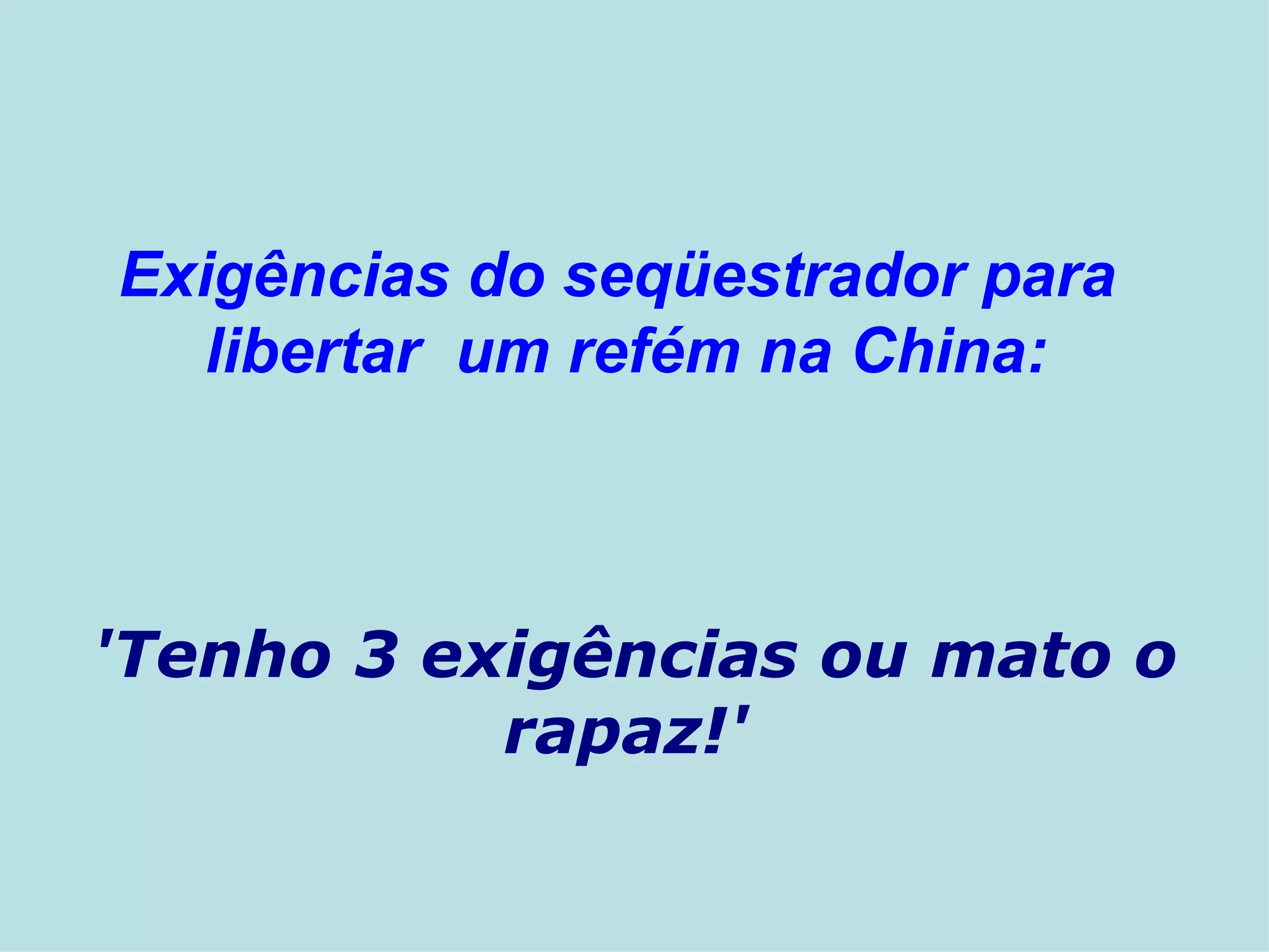 Um seqüestrador na China fez 3 exigências para libertar um refém, negociadores chegaram para cumprir as exigências e resolver a situação de forma rápida e eficiente, diferente do que ocorreria no Brasil onde o processo seria mais longo e dispendioso.