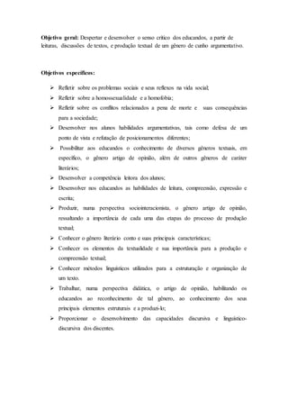 Este documento descreve uma sequência didática de um projeto de incentivo à docência que aborda os direitos humanos. O projeto inclui discussões sobre desigualdade social, preconceito homofóbico e pena de morte. Os estudantes lerão e analisarão textos sobre esses temas e produzirão um artigo de opinião.