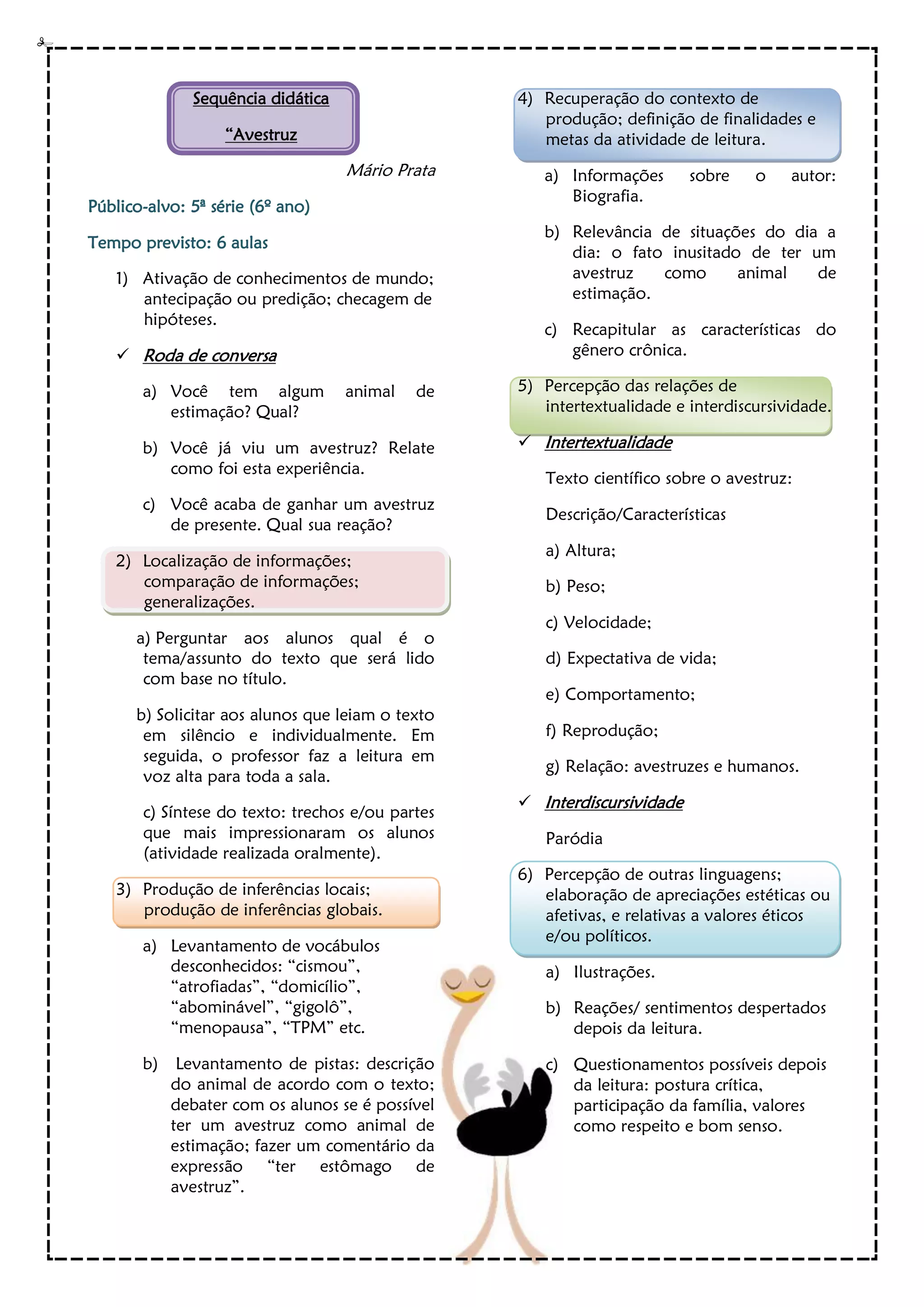 Este documento apresenta uma sequência didática sobre avestruzes para alunos do 6o ano. A sequência é dividida em 6 aulas e aborda tópicos como ativação de conhecimentos prévios sobre avestruzes, leitura e discussão de um texto sobre ter um avestruz como animal de estimação, produção de inferências a partir do texto, contextualização histórica sobre o autor e o gênero literário, intertextualidade com um texto científico sobre características de avestruzes, e reflexão sobre outras linguagens e valores éticos relacion