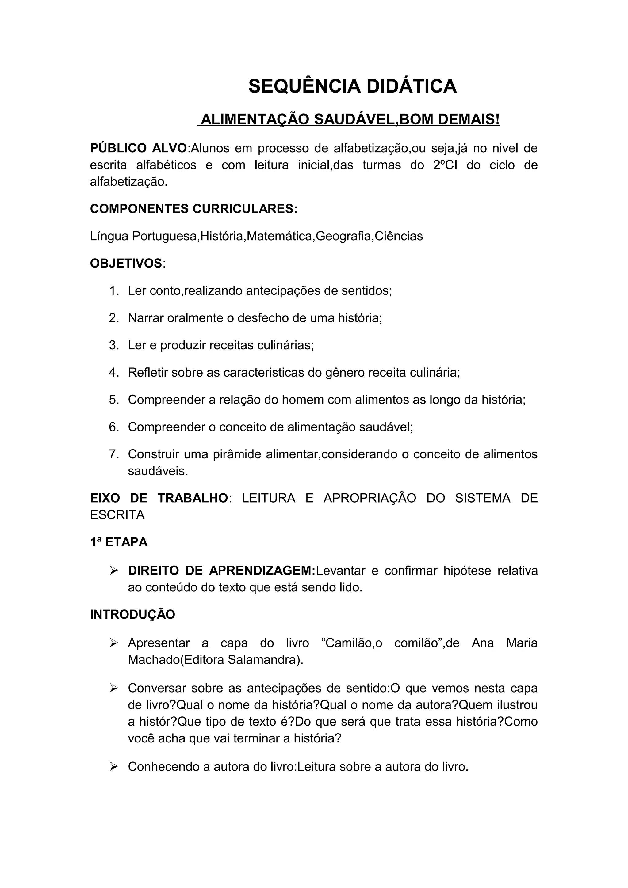 Esta sequência didática tem como objetivo ensinar alunos do 2o ano sobre alimentação saudável através da leitura e análise do livro "Camilão, o comilão". Ao longo de 11 etapas, os alunos irão ler e discutir o livro, identificar diferentes tipos de alimentos, construir uma pirâmide alimentar, e escrever sua própria história sobre uma festa de Camilão.