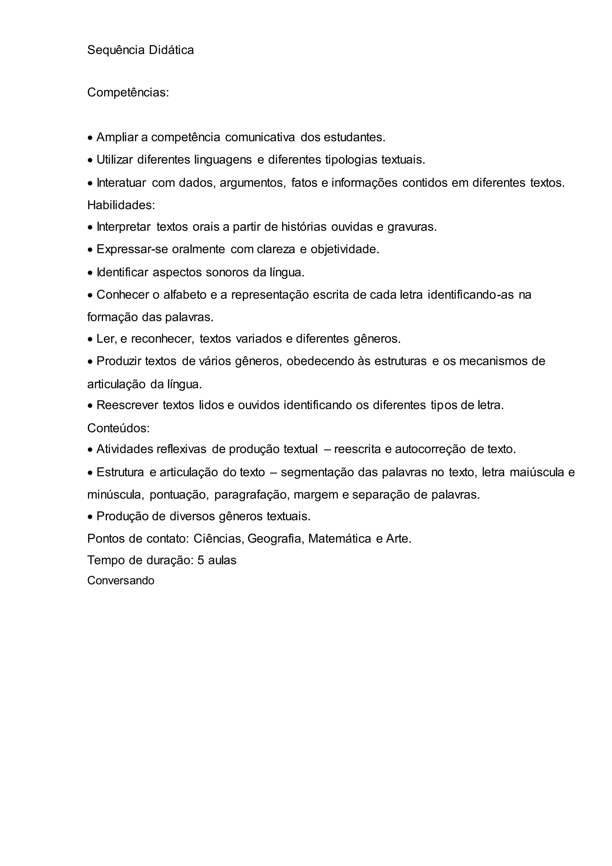 Este documento descreve uma sequência didática com o objetivo de ampliar as habilidades comunicativas e de leitura dos estudantes. As aulas irão trabalhar com interpretação e produção de textos de diferentes gêneros, reconhecimento de letras e pontuação. A primeira aula apresenta a fábula "O Leão e o Rato" e atividades relacionadas à história.