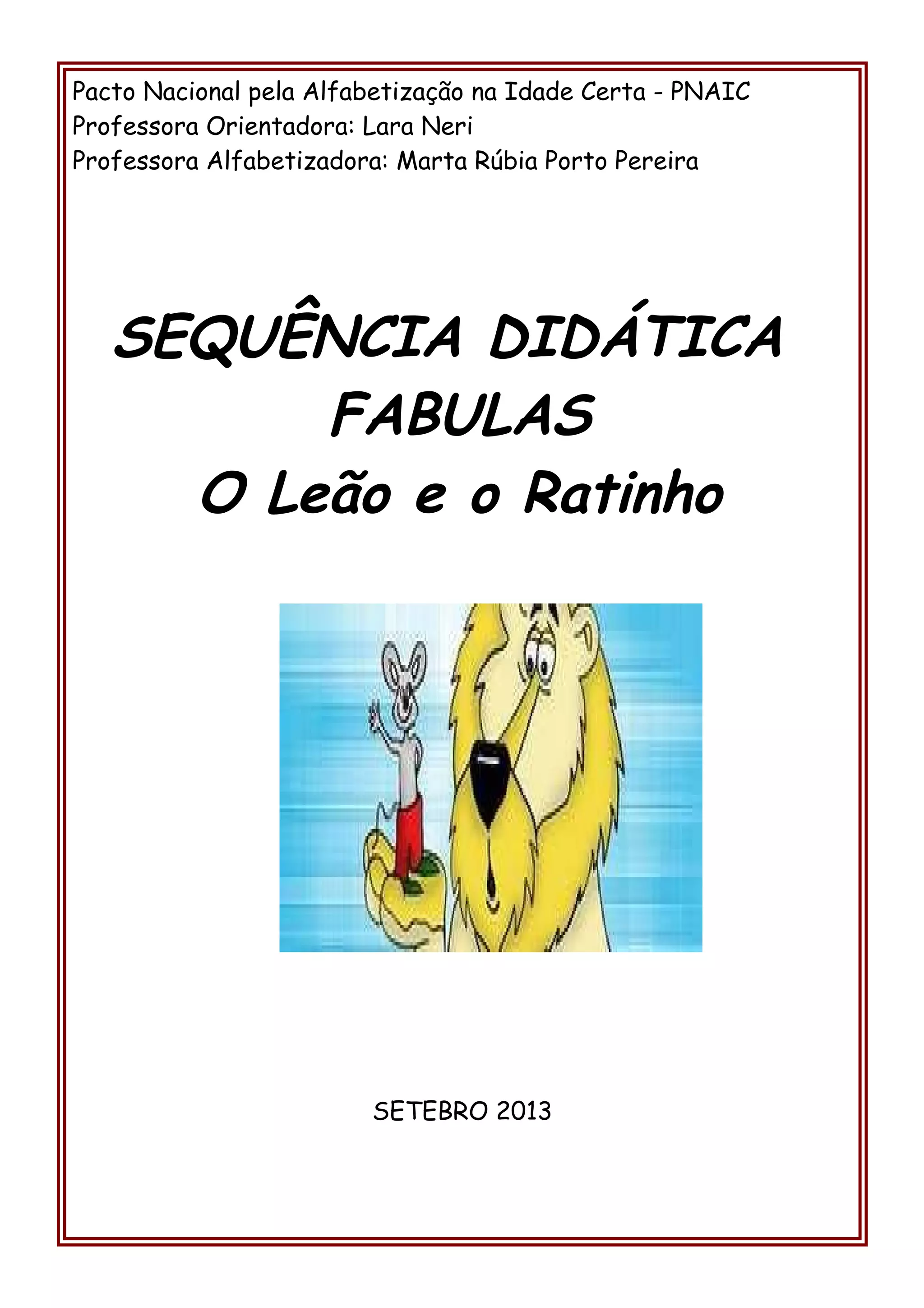 Este documento apresenta uma sequência didática para trabalhar com alunos do 3o ano do ensino fundamental focada na leitura da fábula "O Leão e o Ratinho". A sequência inclui atividades como discussão sobre o gênero da fábula, levantamento de hipóteses sobre a história, leitura do texto, identificação de elementos da narrativa e atividades de consolidação focadas em dificuldades ortográficas comuns.
