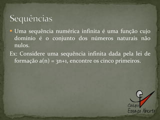 O documento discute sequências numéricas, incluindo sequências infinitas, progressões aritméticas e geométricas, além da famosa sequência de Fibonacci. São apresentadas fórmulas para calcular termos e somas dessas sequências, juntamente com exemplos práticos de aplicação em contextos como instalação de telefonia e crescimento populacional. O texto fornece uma base matemática para entender como as sequências funcionam e suas características principais.