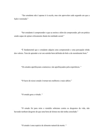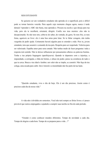 Este documento enfatiza a importância do estudo para os estudantes. Ele incentiva os estudantes a não apenas aprender o básico, mas também o difícil, e a procurar na escola o que desejam para suas vidas. Também enfatiza a necessidade de respeito, valorização do próximo e espalhamento de amor.