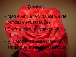 Ser feliz não é estar livre de perdas e frustrações, mas sim ser capaz de encontrar alegria mesmo nos momentos difíceis. A felicidade vem de apreciar as pequenas coisas da vida e extrair emoções delas, de valorizar tanto os momentos de alegria quanto os de tristeza, e de ter coragem para enfrentar os próprios sentimentos e erros. A felicidade é uma conquista que vem de dentro e de saber transformar os desafios em lições.