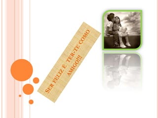 O documento descreve várias formas de ser feliz, incluindo dar beijinhos, amar os amigos, ter um amigo especial para apoiar em bons e maus momentos, estar com alguém dos sonhos, ir às aulas, ver filmes e ter amigos.