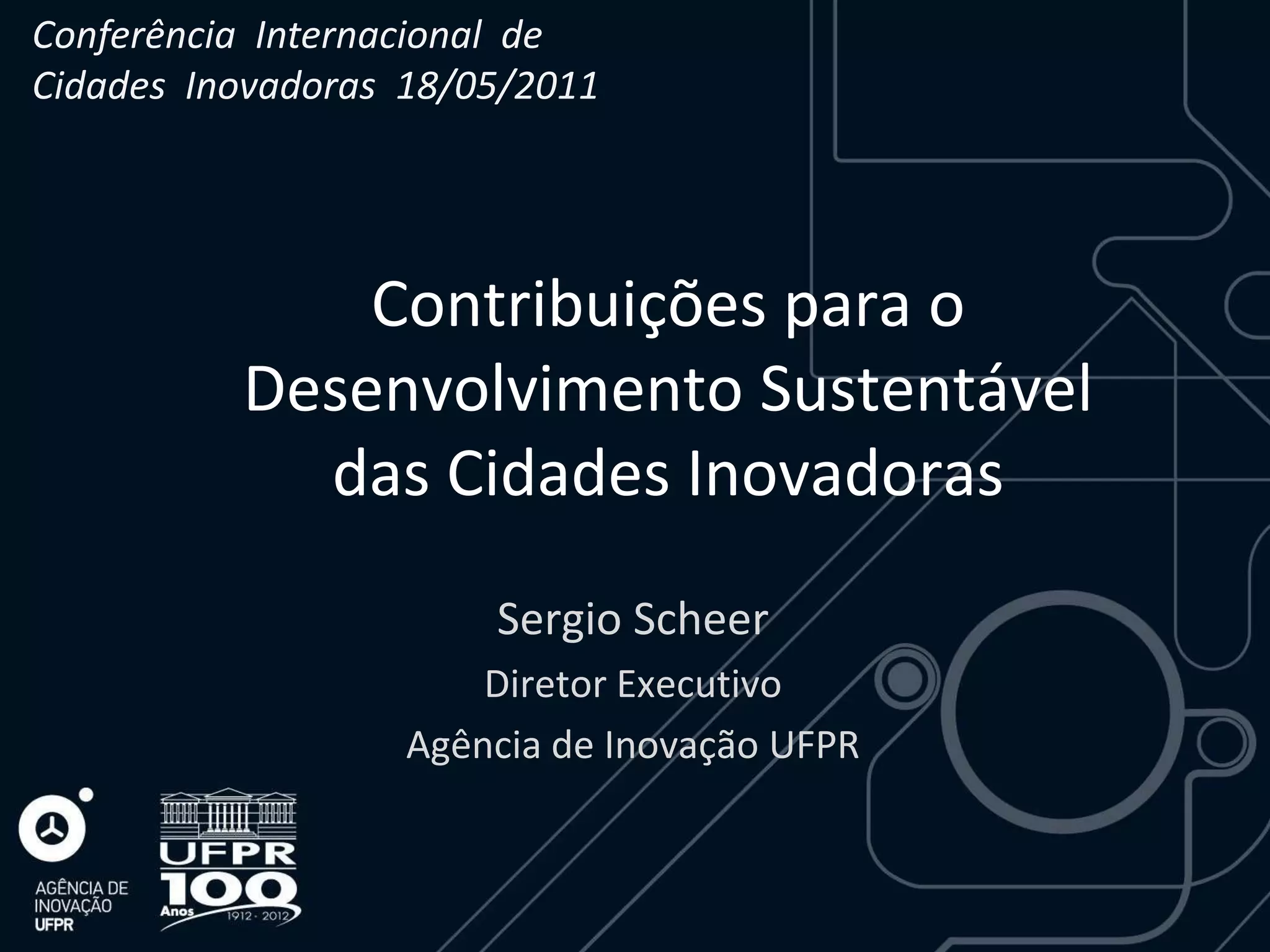 O documento discute a conferência internacional sobre cidades inovadoras, destacando a importância da sustentabilidade e inovação em ambientes urbanos. Apresenta a atuação da Universidade Federal do Paraná (UFPR) em pesquisa e desenvolvimento, bem como seus esforços para o empreendedorismo e incubação de empresas. Além disso, menciona a transferência de tecnologia e os desafios enfrentados por empresas em um mercado em constante mudança.