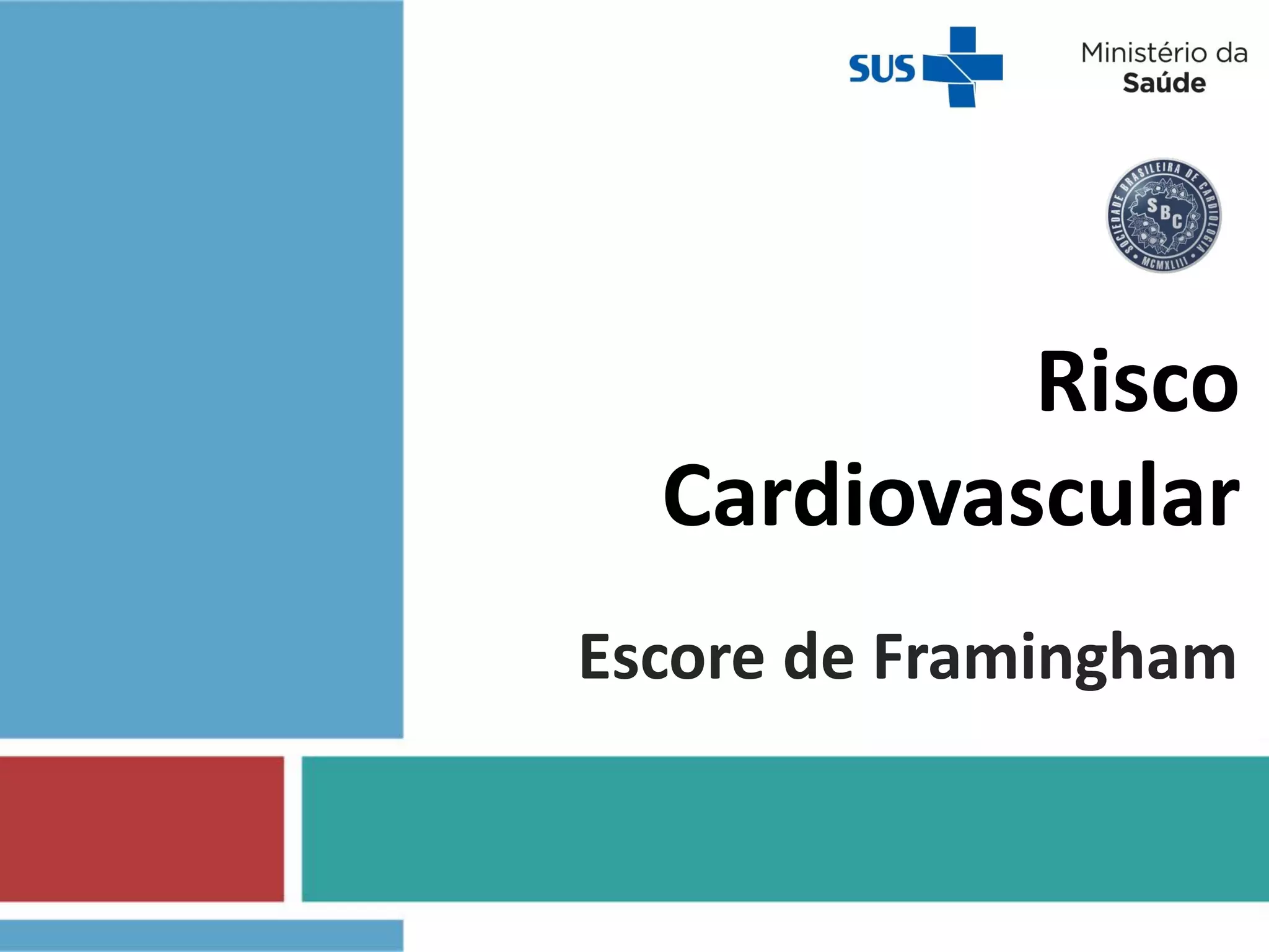 O documento discute a avaliação do risco cardiovascular de um paciente através do escore de Framingham, que classifica o risco em baixo, intermediário ou alto com base em fatores de risco. O caso exemplifica o cálculo do escore para um paciente, Sergio, que apresenta fatores de baixo risco e é classificado em risco cardiovascular baixo.