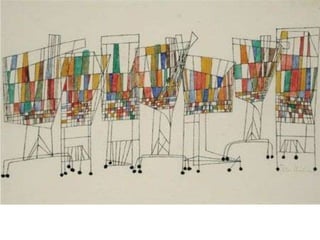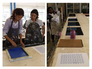 O documento descreve a técnica da serigrafia, sua origem na China e desenvolvimento na Europa no século XIX. Também discute como artistas nos EUA no século XX transformaram a serigrafia de um método comercial para uma importante ferramenta artística, especialmente com o uso de fotografia e no movimento Pop Art, removendo barreiras à serigrafia como arte. Exemplos de obras de Andy Warhol, Roy Lichtenstein, Victor Vasarely e Josef Albers são apresentados.