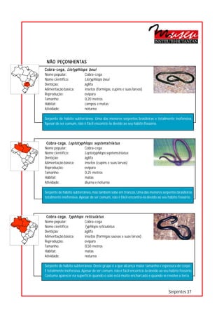 O documento descreve as principais serpentes brasileiras não peçonhentas. Ele lista diversas famílias e espécies de cobras encontradas no Brasil, fornecendo detalhes como nome popular e científico, hábitos alimentares, tamanho, habitat e características de cada uma. As serpentes descritas variam em tamanho de 20 cm a 10 metros e incluem tanto espécies terrestres quanto aquáticas e arborícolas.