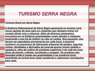 O documento descreve as opções de turismo rural na Estância Hidromineral de Serra Negra, como visitar chácaras e fazendas para conhecer a produção artesanal de queijos, vinhos e derivados da cana-de-açúcar, além do cultivo de produtos orgânicos e café.