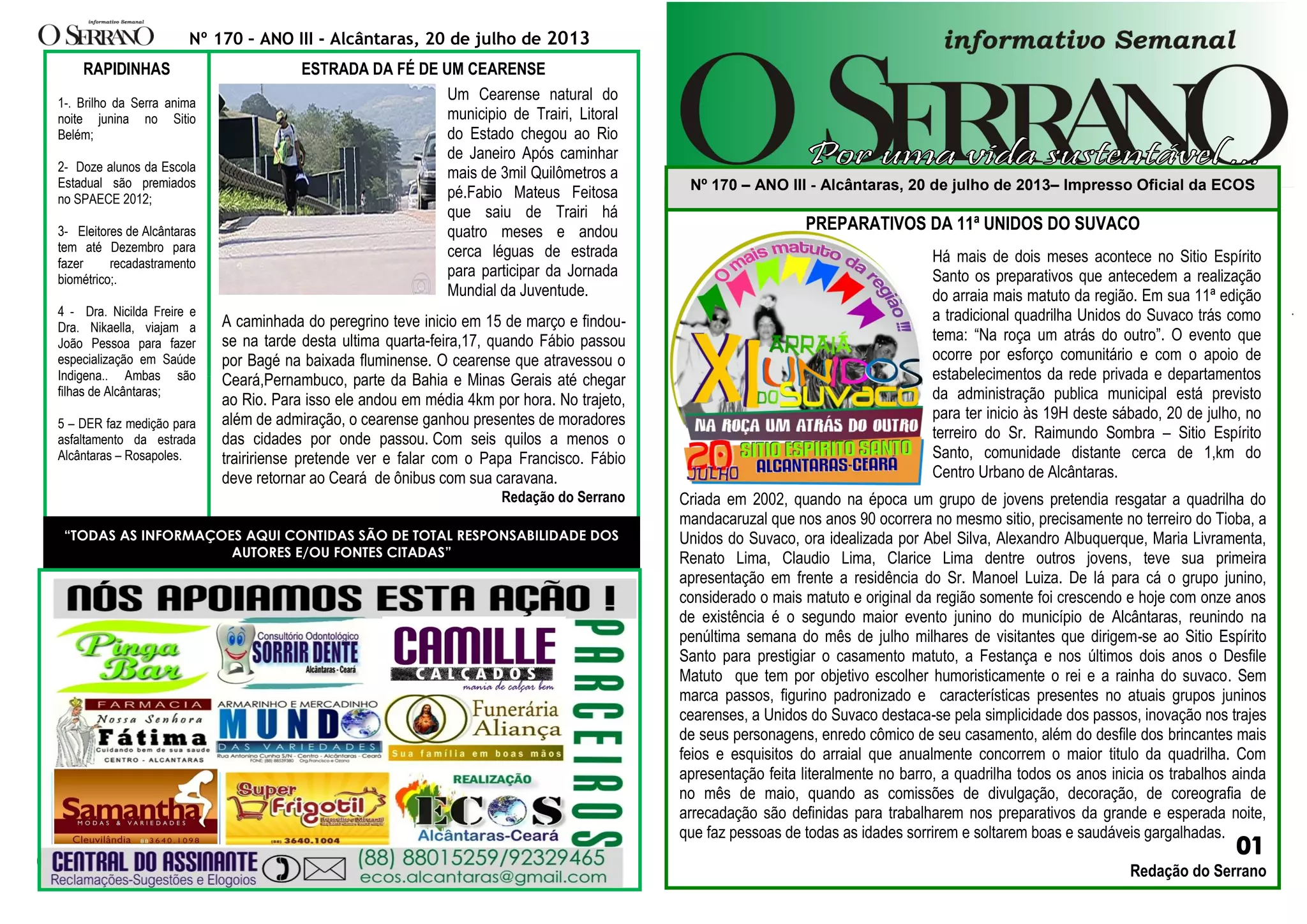Há mais de dois meses acontecem os preparativos para a 11a edição da tradicional quadrilha Unidos do Suvaco no Sitio Espírito Santo. O evento está previsto para começar às 19h do dia 20 de julho no terreiro do Sr. Raimundo Sombra, a 1km do centro de Alcântaras. Além disso, 11 jovens de Alcântaras participarão da Jornada Mundial da Juventude no Rio de Janeiro neste final de semana. Finalmente, o único açude de Alcântaras secou complet