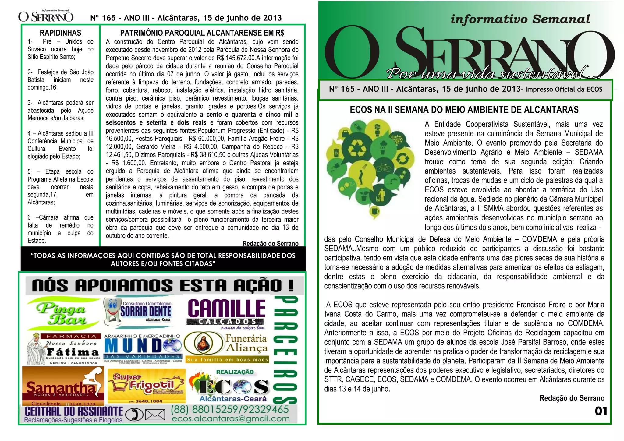 A ECOS participou da II Semana do Meio Ambiente de Alcântaras, abordando o uso racional da água. O evento promovido pela SEDAMA discutiu ações ambientais no município e iniciativas para criar ambientes sustentáveis, como oficinas e troca de mudas. A ECOS também capacitou alunos sobre reciclagem anteriormente. Alcântaras teve bom índice de vacinação contra a febre aftosa, imunizando 96,45% do rebanho.