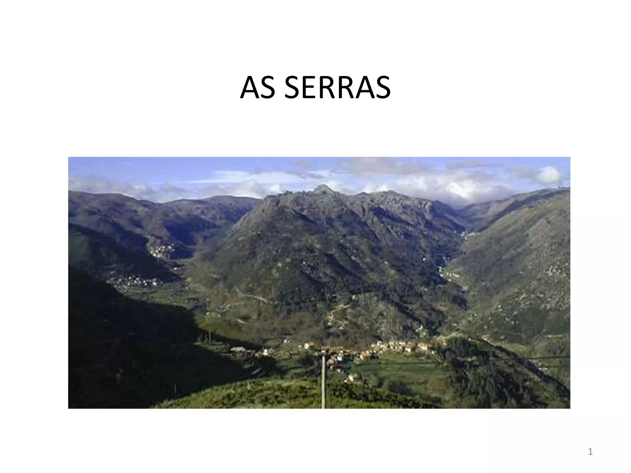O documento descreve as principais serras de Portugal, incluindo suas altitudes. A serra mais alta é a Serra da Estrela com 1991 metros, seguida pela montanha do Pico nos Açores com 2351 metros. Outras serras importantes mencionadas incluem a Serra do Gerês, Serra do Soajo, e Serra do Marão.