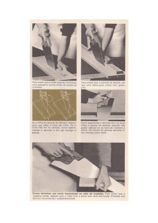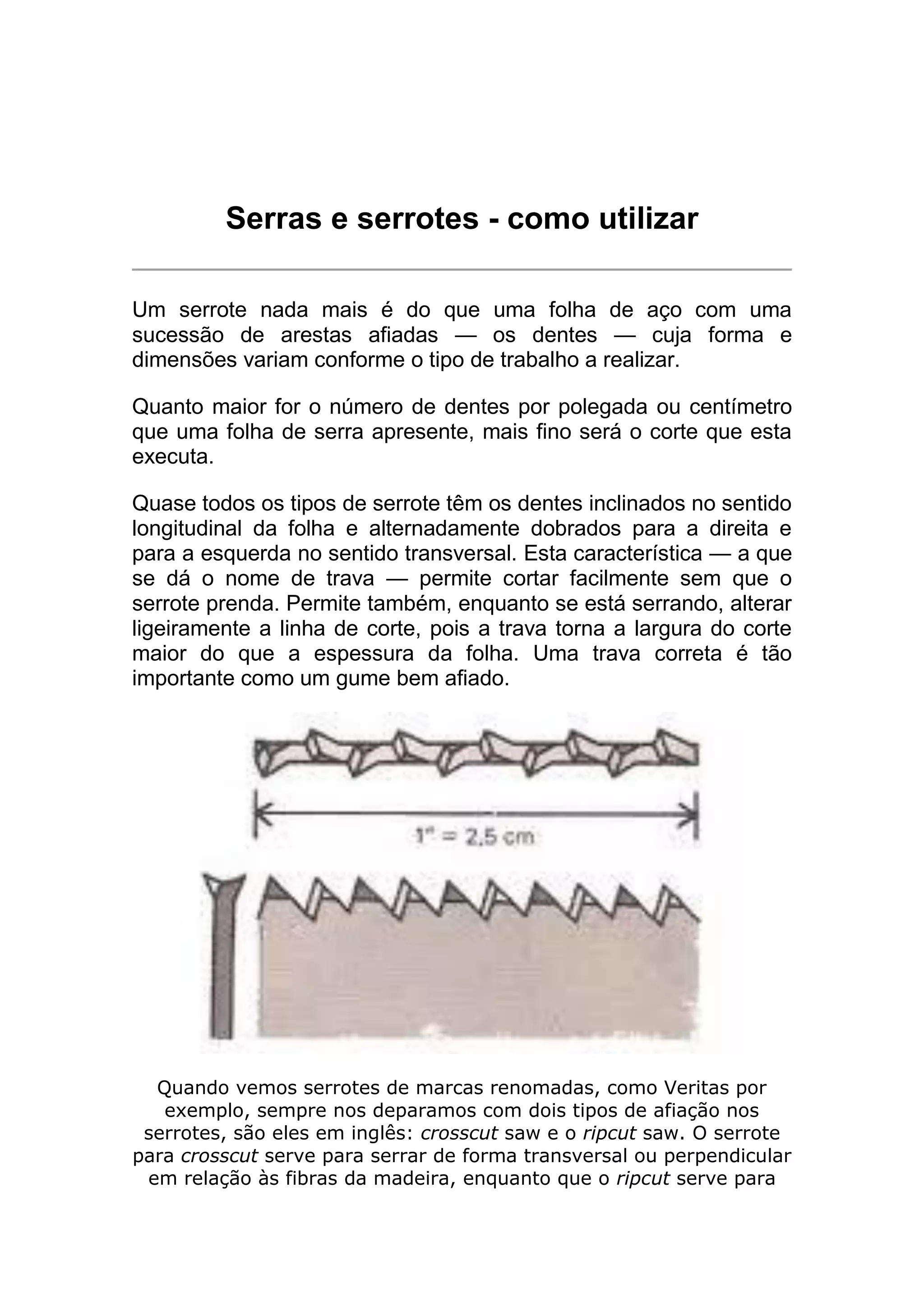 Existem dois tipos principais de dentes em serrotes: dentes rip, em formato de formão para cortes longitudinais, e dentes crosscut, em formato de ponta de faca para cortes transversais. Cada tipo de dente é mais eficiente para o corte correspondente, pois os dentes rip cortam fibras da madeira de forma longitudinal enquanto os dentes crosscut cortam as fibras transversalmente.