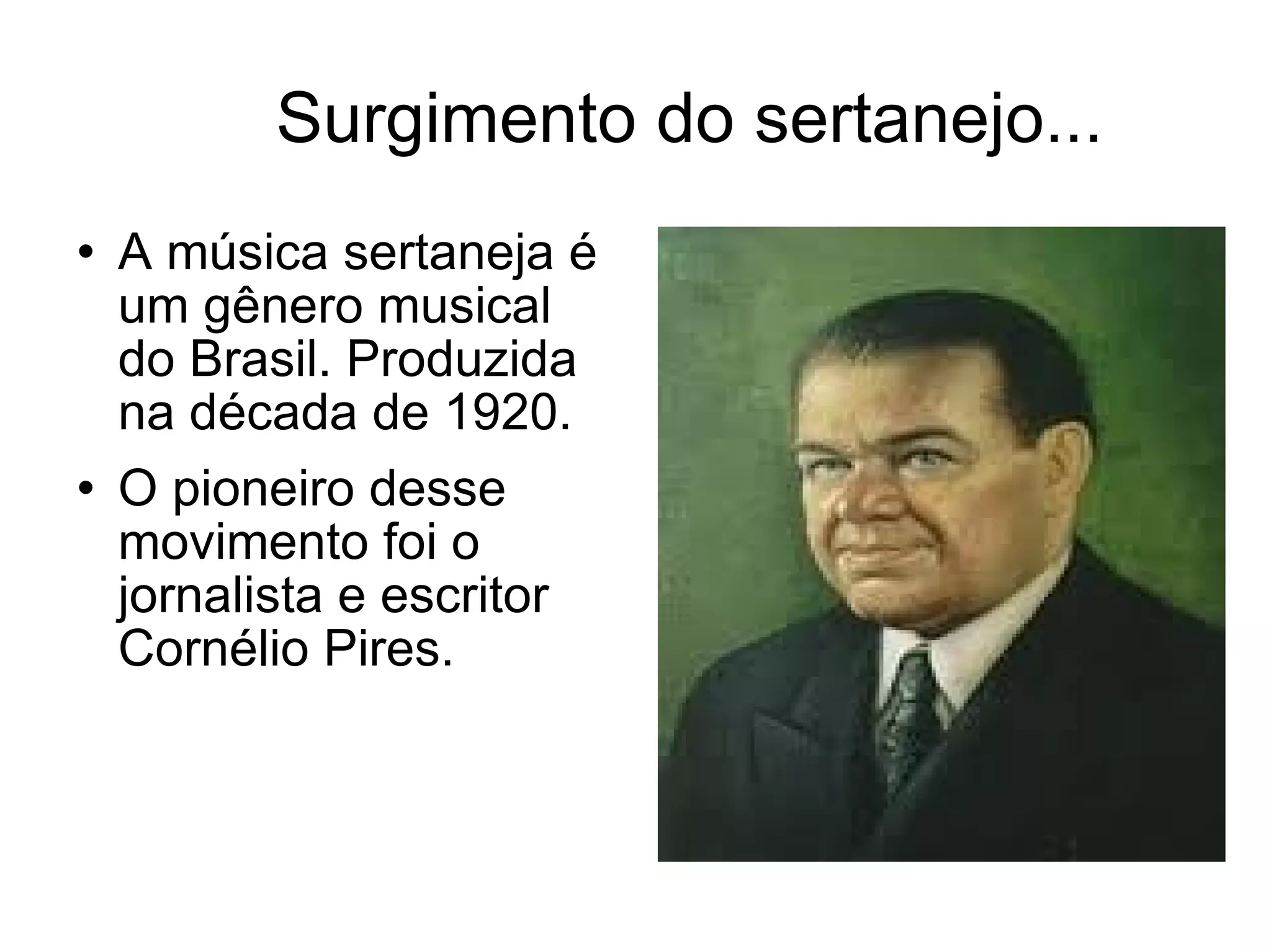 A música sertaneja surgiu no Brasil na década de 1920, impulsionada pelo jornalista Cornélio Pires. No início da década seguinte, Mario de Andrade promoveu um grupo musical sertanejo. Na década de 1930, a dupla Alvarenga e Ranchinho se tornou uma das mais importantes do gênero. Posteriormente, surgiu o estilo "sertanejo universitário", com cantores mais jovens e letras menos regionais.