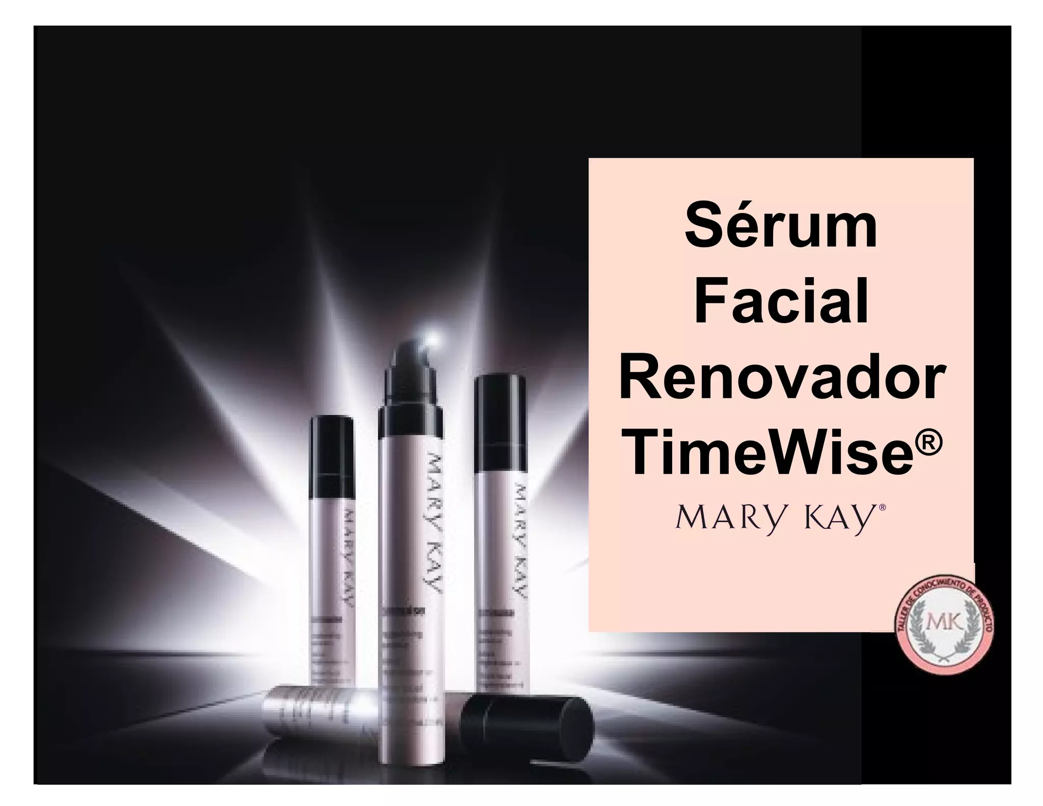 O documento descreve o Sérum Facial Renovador TimeWise, um produto da Mary Kay que atua no colágeno e elastina para deixar a pele mais firme. Contém extratos de plantas com ação antioxidante e hidratante. Estudos mostraram que 90% dos usuários observaram melhora na aparência da pele após duas semanas de uso.