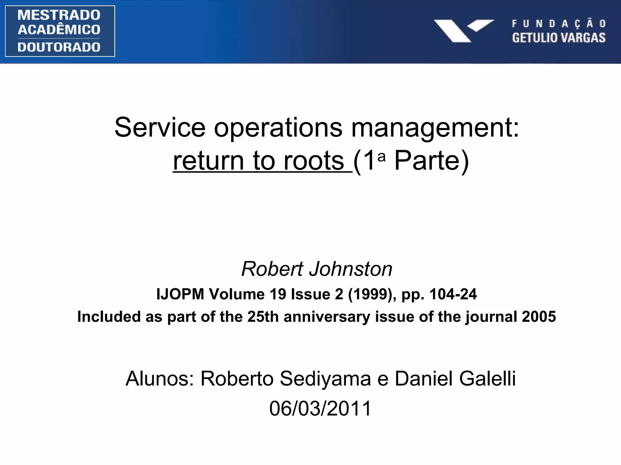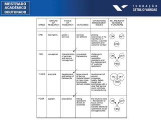 O documento discute a evolução da gestão de operações de serviços desde os anos 1980, quando o foco começou a mudar de produção para serviços. Dividiu esta evolução em 4 estágios, do "rastejar" inicial para o entendimento atual, passando por estágios de alto interesse e testes empíricos. Também levanta questões futuras sobre medição de desempenho, gestão de pessoas, design de serviços e gerenciamento de capacidade.