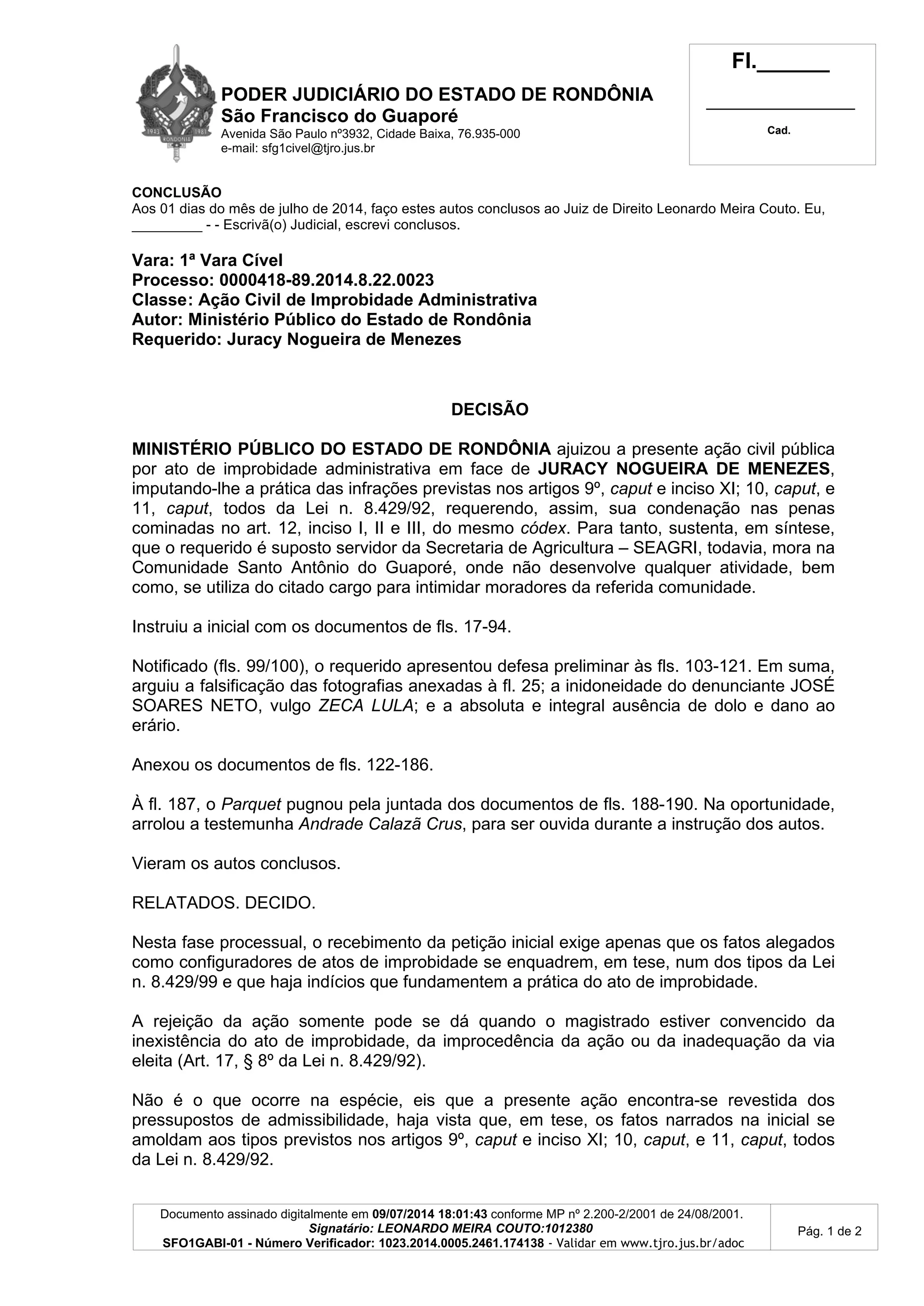 O documento descreve uma decisão judicial em uma ação civil por improbidade administrativa movida pelo Ministério Público contra Juracy Nogueira de Menezes. O juiz recebeu a ação inicial, citou o réu e o Estado de Rondônia para integrar o polo ativo, e determinou que após a contestação os autos sejam conclusos para dar vista ao MP e eventuais litisconsortes.