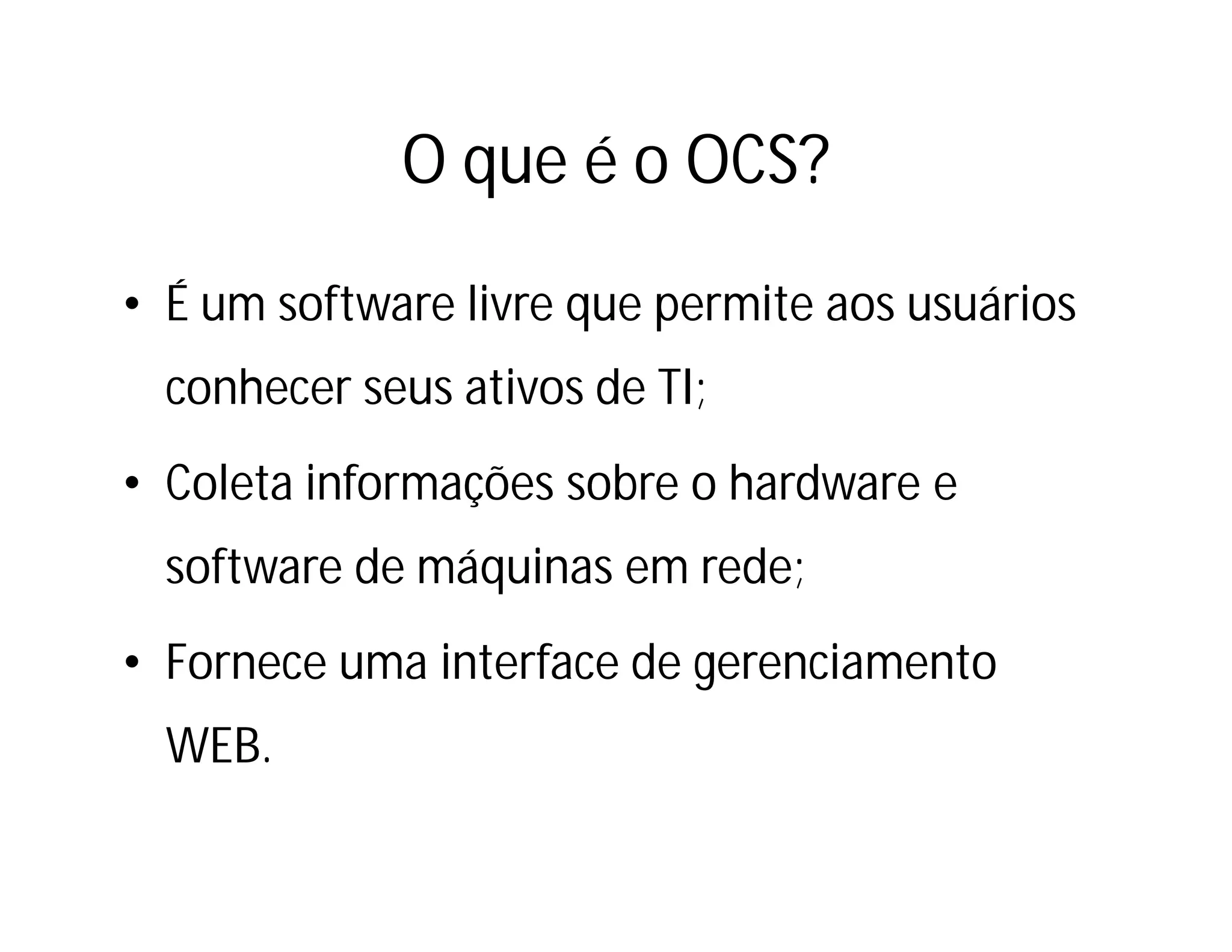 Este documento fornece instruções passo a passo para configurar um servidor LAMP no Debian para hospedar o software de inventário de ativos OCS Inventory. Ele explica como instalar e configurar o Apache, PHP, MySQL e outros pacotes necessários, baixar e instalar o OCS Inventory, e concluir a configuração para que o sistema funcione corretamente.