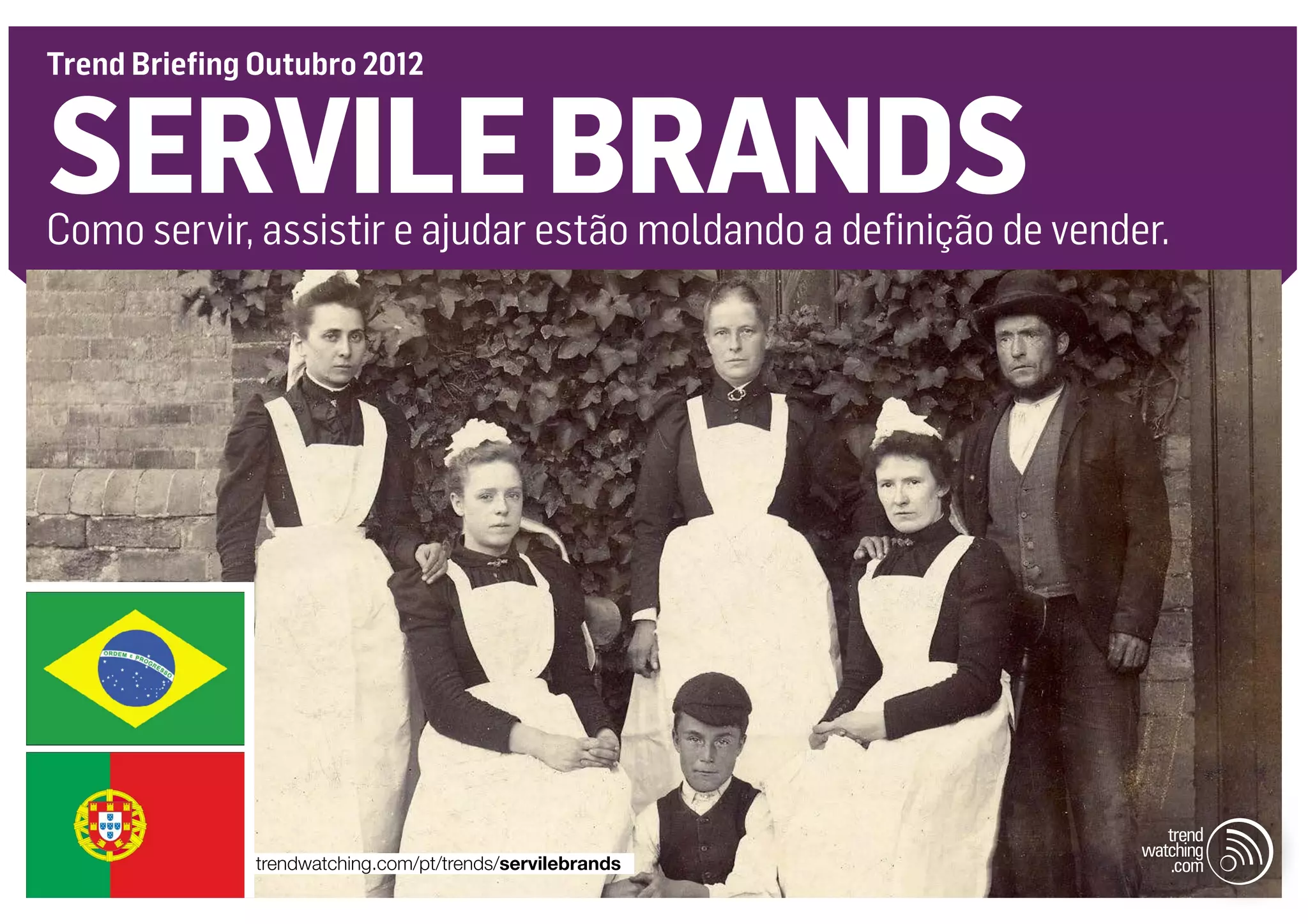 O documento discute o conceito de 'servile brands', que são marcas que buscam atender as necessidades e desejos dos clientes de forma proativa, em resposta às crescentes exigências dos consumidores por conveniência e experiências personalizadas. Ele destaca a importância de um excelente atendimento ao cliente e como a confiança nas recomendações boca-a-boca está aumentando, enquanto a confiança em mídias pagas tem diminuído. A tendência é impulsionada por mudanças no comportamento dos consumidores, que buscam gratificação imediata e soluções que maximizem seu tempo e experiências.