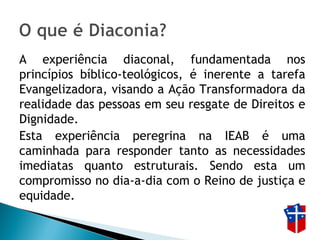 O documento discute o serviço anglicano de diaconia e desenvolvimento da Igreja Episcopal Anglicana do Brasil. Ele descreve a experiência diaconal como essencial para a evangelização e transformação da realidade das pessoas através do resgate de seus direitos e dignidade. O serviço trabalha para atender tanto necessidades imediatas quanto estruturais de forma participativa e estratégica.