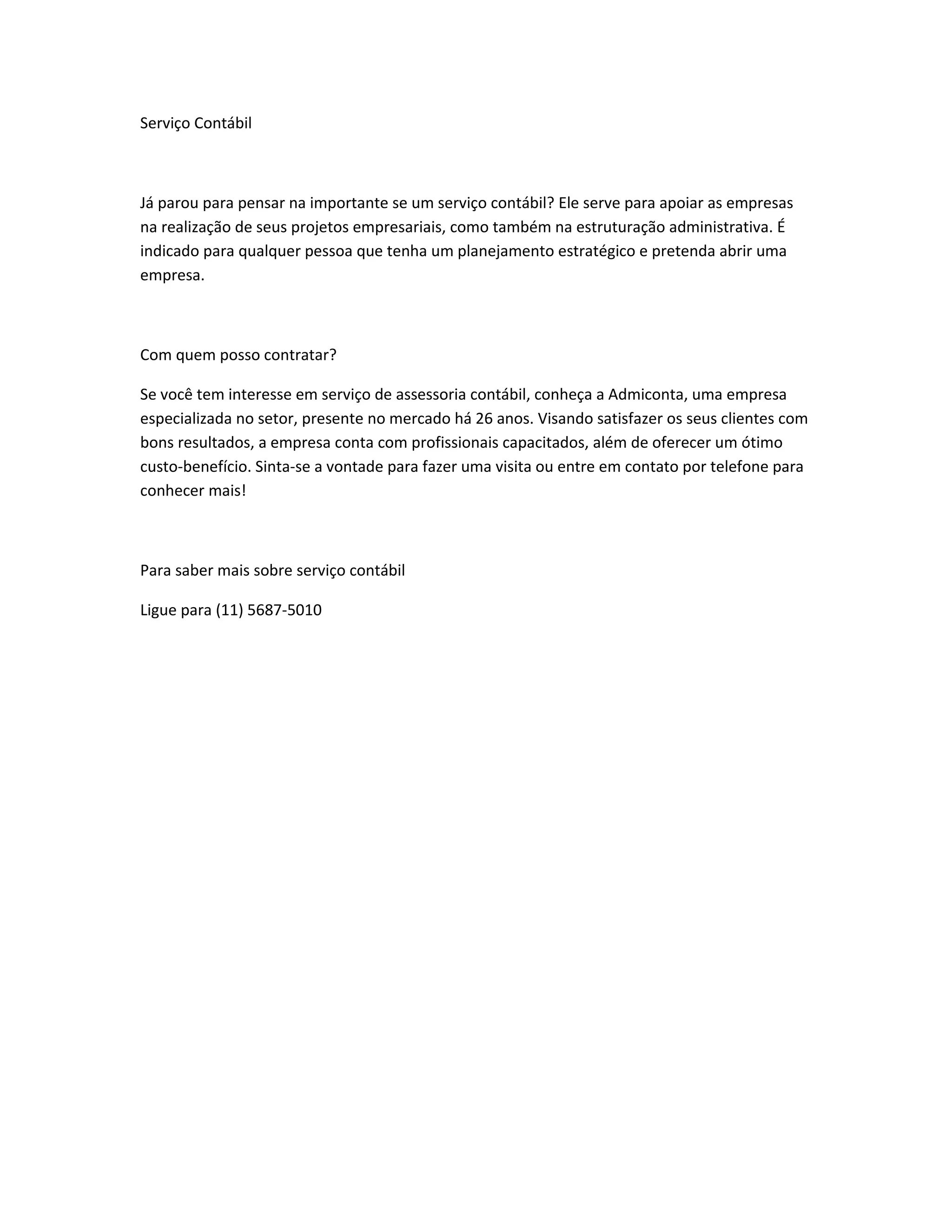 O documento destaca a importância dos serviços contábeis para apoiar empresas em seus projetos e estruturação administrativa. Recomenda a Admicontra, uma empresa com 26 anos de experiência, como opção para assessoria contábil, oferecendo profissionais capacitados e bom custo-benefício. Contatos e informações adicionais estão disponíveis por telefone.