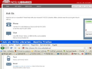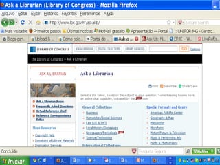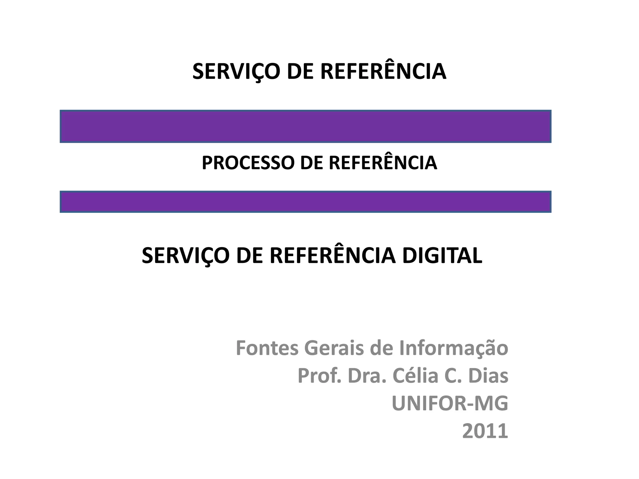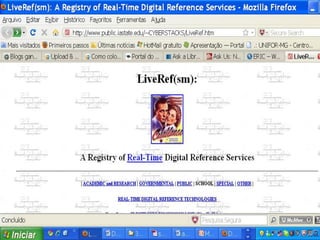 O documento descreve o serviço de referência, seu processo e como vem se adaptando ao ambiente digital. Apresenta as fases e passos do processo de referência tradicional e exemplos de serviços de referência digital, como AskERIC, Real-Time Librarian e referência via chat e email.
