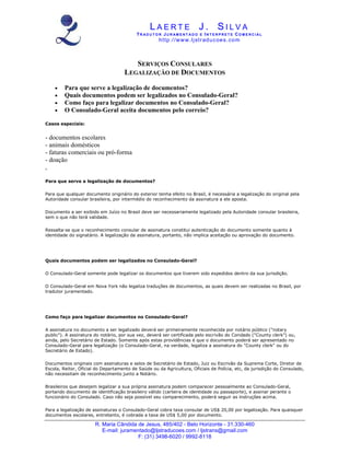 O documento fornece diretrizes sobre a legalização de documentos no consulado-geral do Brasil, incluindo quais documentos podem ser legalizados e os procedimentos necessários. Destaca-se a importância da legalização para que documentos do exterior tenham validade no Brasil e menciona taxas aplicáveis para diferentes tipos de documentos. Também aborda a legalização de documentos relacionados a animais domésticos e doações a instituições filantrópicas.