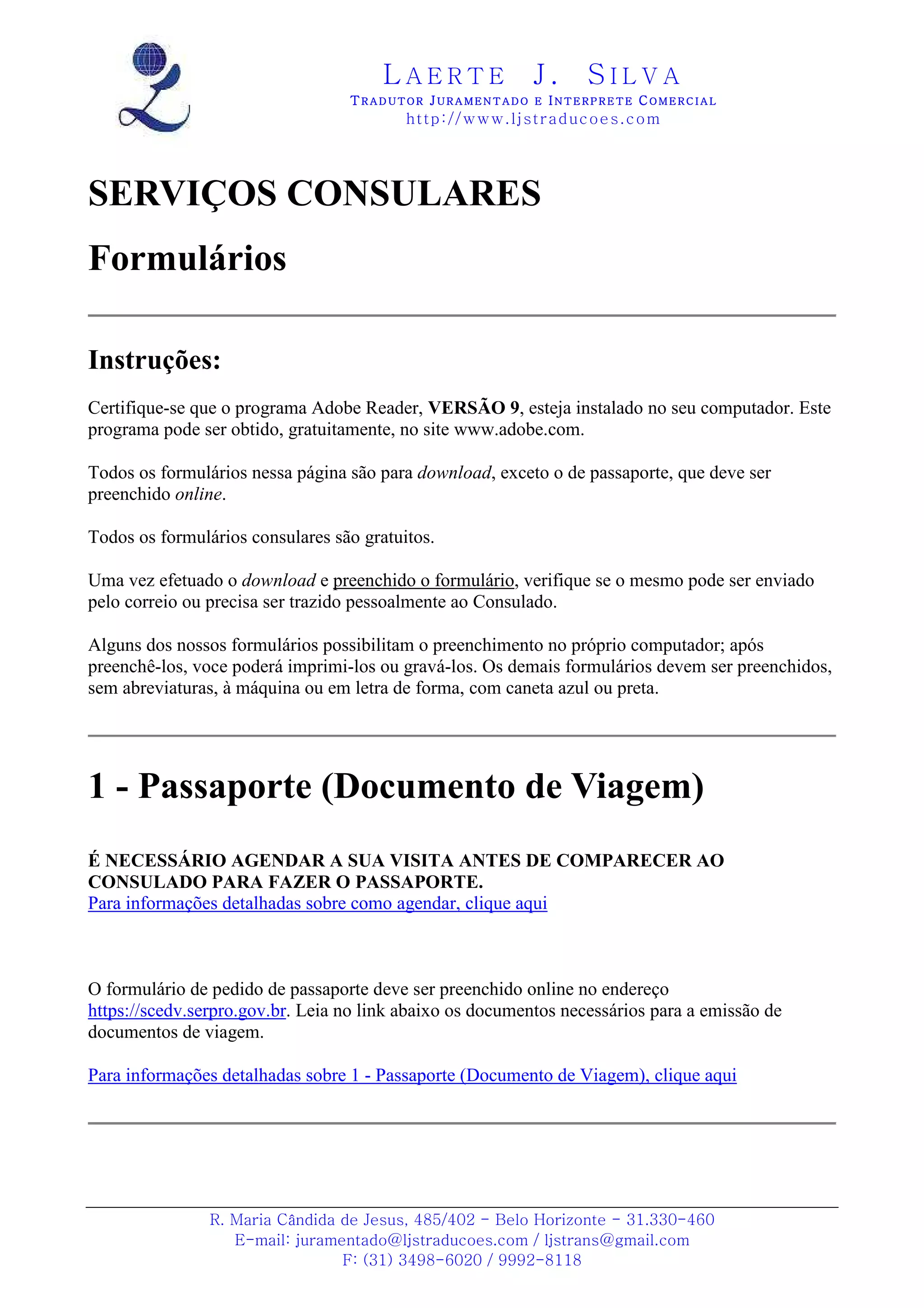 Este documento fornece instruções sobre vários formulários consulares brasileiros e seus respectivos serviços, incluindo passaporte, registro civil, alistamento militar e justificativa eleitoral. Informa onde encontrar e como preencher cada formulário on-line ou para download, e quais documentos são necessários.