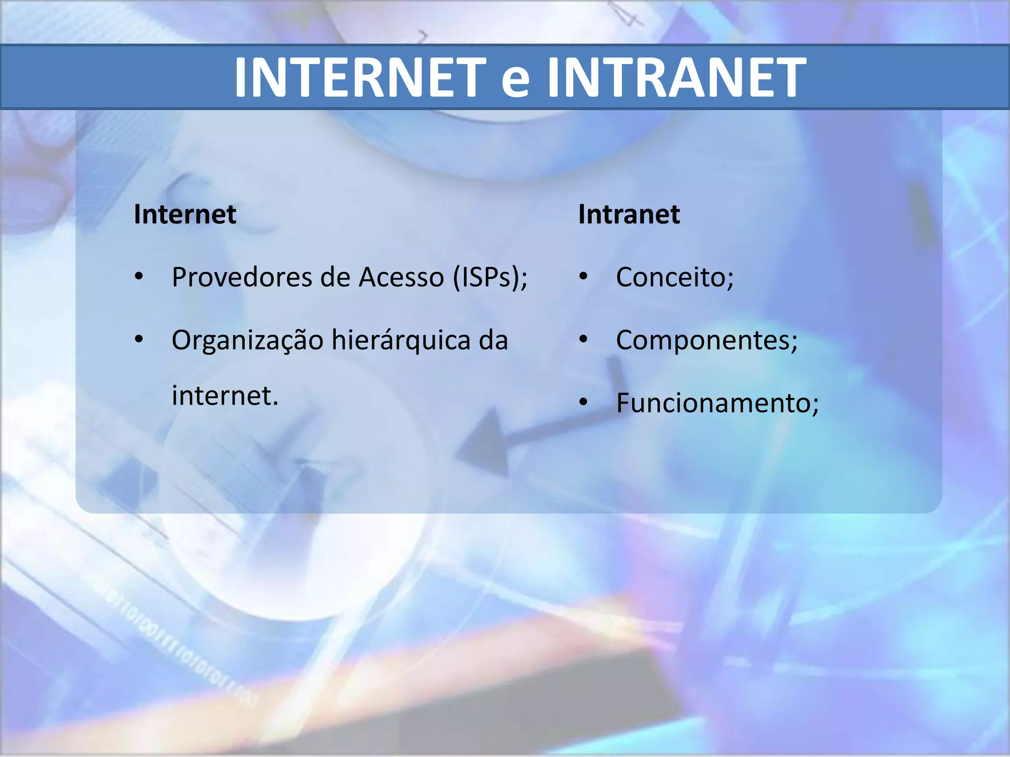 O documento discute conceitos fundamentais de redes de computadores, incluindo: (1) a diferença entre Internet e Intranet, (2) como funcionam provedores de acesso à Internet, (3) protocolos como HTTP, FTP e de roteamento, e (4) tipos de servidores como servidores web e de e-mail.