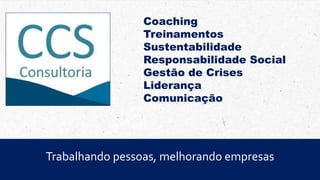 A CCS Consultoria oferece serviços de coaching, treinamentos, gestão de crises, responsabilidade social e comunicação. Eles trabalham com indivíduos, equipes e empresas em processos de desenvolvimento pessoal e profissional, alinhamento de equipes, gestão de conflitos, estratégia e reputação. A empresa é dirigida por Karen Gimenez, com experiência em multinacionais e foco em melhorar pessoas e empresas.