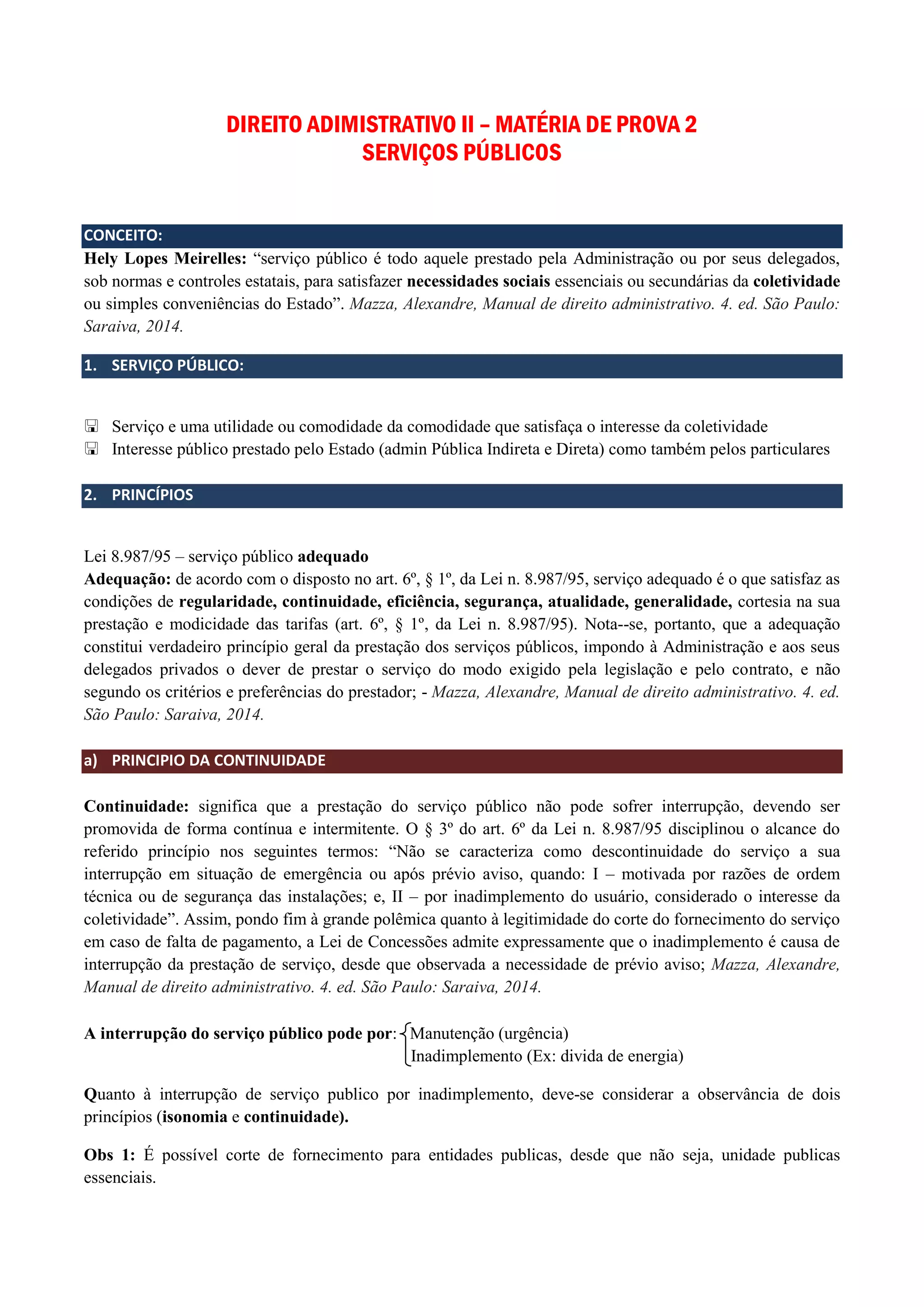 O documento discute os conceitos e princípios dos serviços públicos no Brasil. Define serviço público como qualquer atividade prestada direta ou indiretamente pelo Estado para atender necessidades coletivas e que esteja sujeita a normas e controles estatais. Apresenta os princípios da adequação, continuidade, generalidade, modicidade das tarifas, atualidade, segurança, regularidade e cortesia que devem reger a prestação dos serviços públicos. Discorre também sobre as diferentes formas de prestação e classificação desses serviços.