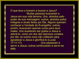 O que levao homem a buscar a Jesus? Muitas pessoas buscaram a Jesus em sua vida terrena. Uns, atraídos pelo poder de sua mensagem; outros, atraídos pelos milagres e sinais feitos por Ele. Alguns queriam conhecer a Verdade do Evangelho; outros, porém, buscavam apenas curas para seus males. Uns souberam ser gratos a Jesus e adorá-lo, como um dos dez leprosos curados por ele; os outros nove não voltaram para agradecer a Jesus e glorificá-lo (Lucas 17:11-17) Uns passaram a servir a Jesus; outros continuaram a servir-se dele.