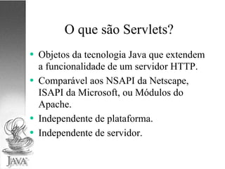 1) O documento discute Servlets e JSP, tecnologias Java para desenvolvimento de aplicações web.