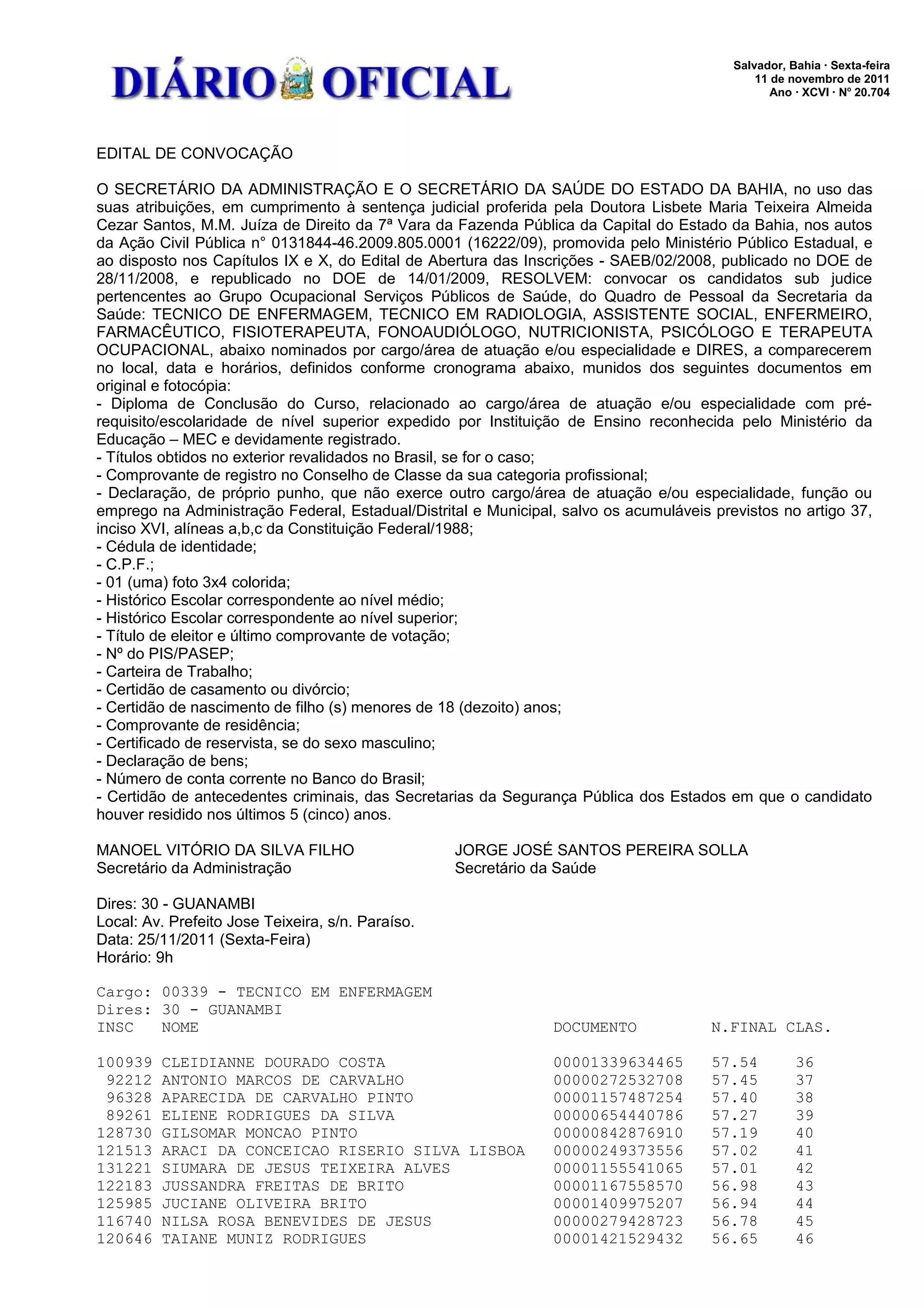 O documento convoca candidatos para preenchimento de vagas em cargos de saúde no estado da Bahia. Os candidatos devem comparecer em datas e locais específicos levando uma lista de documentos originais e cópias para realização de avaliações e nomeações. Os candidatos são listados por cargo, nome e classificação final.