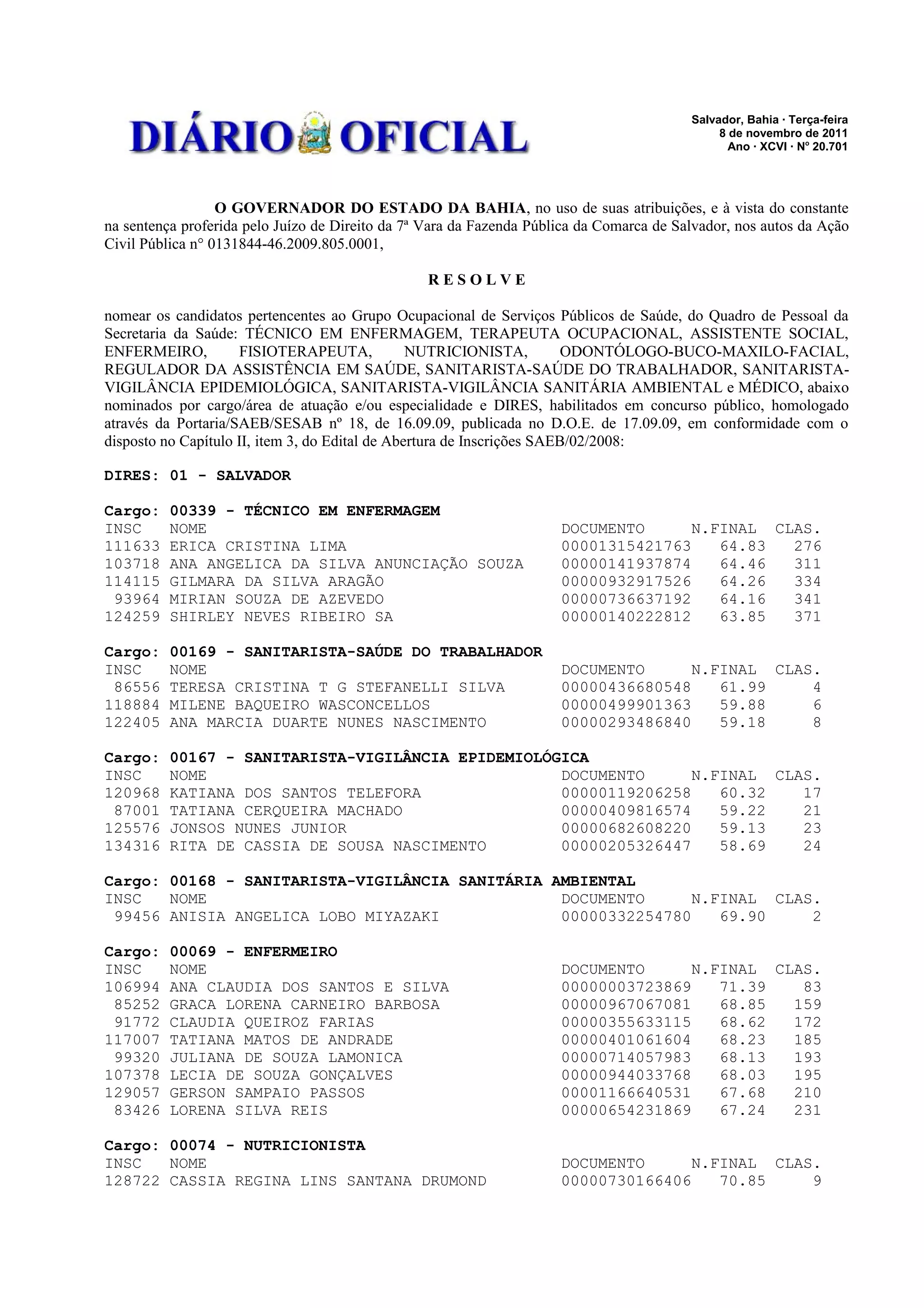 O documento nomeia candidatos aprovados em concurso público para diversos cargos na Secretaria da Saúde da Bahia, listando os nomes, documentos e classificações finais de cada candidato por cargo e local de atuação.