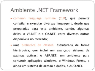 O documento fornece uma visão geral do .NET Framework da Microsoft, que permite a criação de aplicações multiplataforma através de uma biblioteca de classes comum. O .NET Framework inclui o Common Language Runtime para executar várias linguagens de programação compatíveis e bibliotecas de classes para funcionalidades como acesso a dados, rede e segurança. Um exemplo em C# mostra como usar classes do .NET Framework para ler um ficheiro.