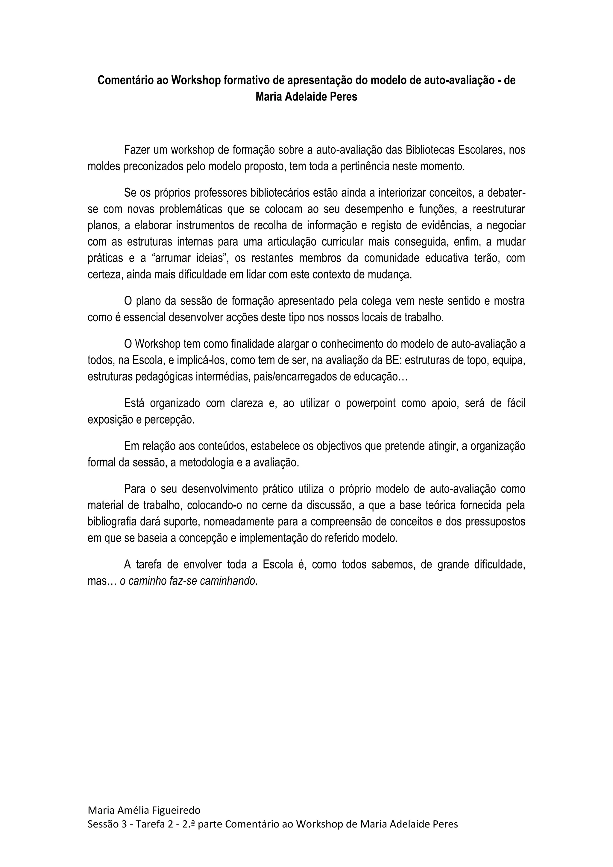 Este documento discute a importância de realizar um workshop de formação sobre auto-avaliação de bibliotecas escolares usando o modelo proposto. O workshop tem como objetivo expandir o conhecimento do modelo para todos na escola e envolvê-los no processo de avaliação da biblioteca. O plano para a sessão de formação é claro e usa powerpoint para facilitar a apresentação dos conceitos-chave.