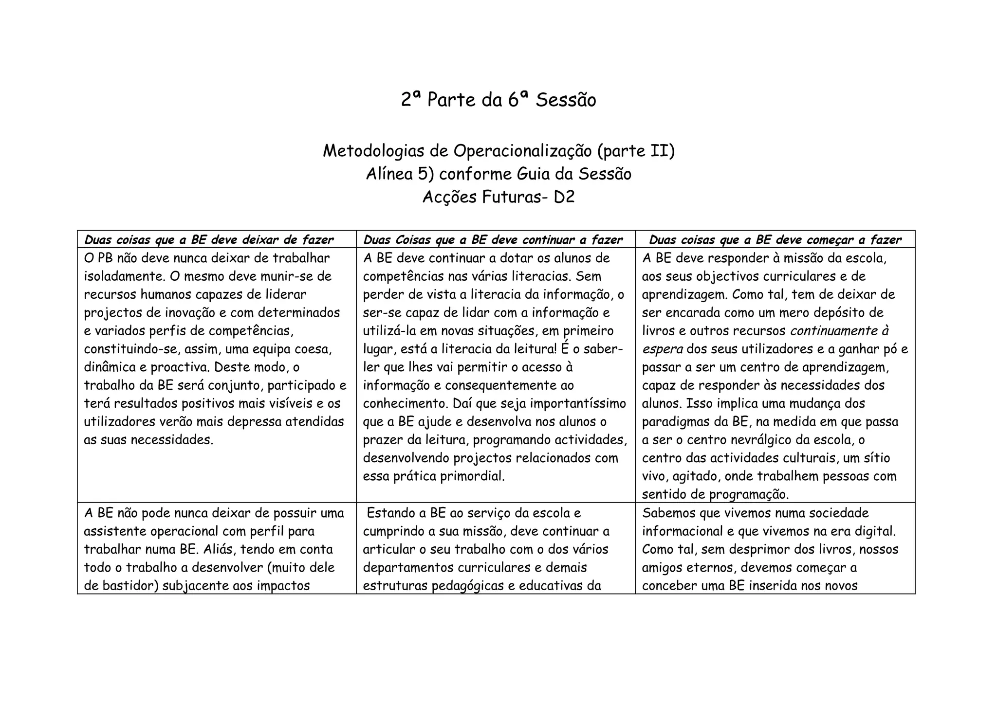 Este documento discute as metodologias de operacionalização da biblioteca escolar (BE) e fornece sugestões para ações futuras. Ele propõe que a BE (1) deixe de trabalhar isoladamente e se torne um centro colaborativo e dinâmico, (2) continue a desenvolver competências de leitura e literacia dos alunos, e (3) se torne um centro de aprendizagem inserido no ambiente digital que promova a inovação.