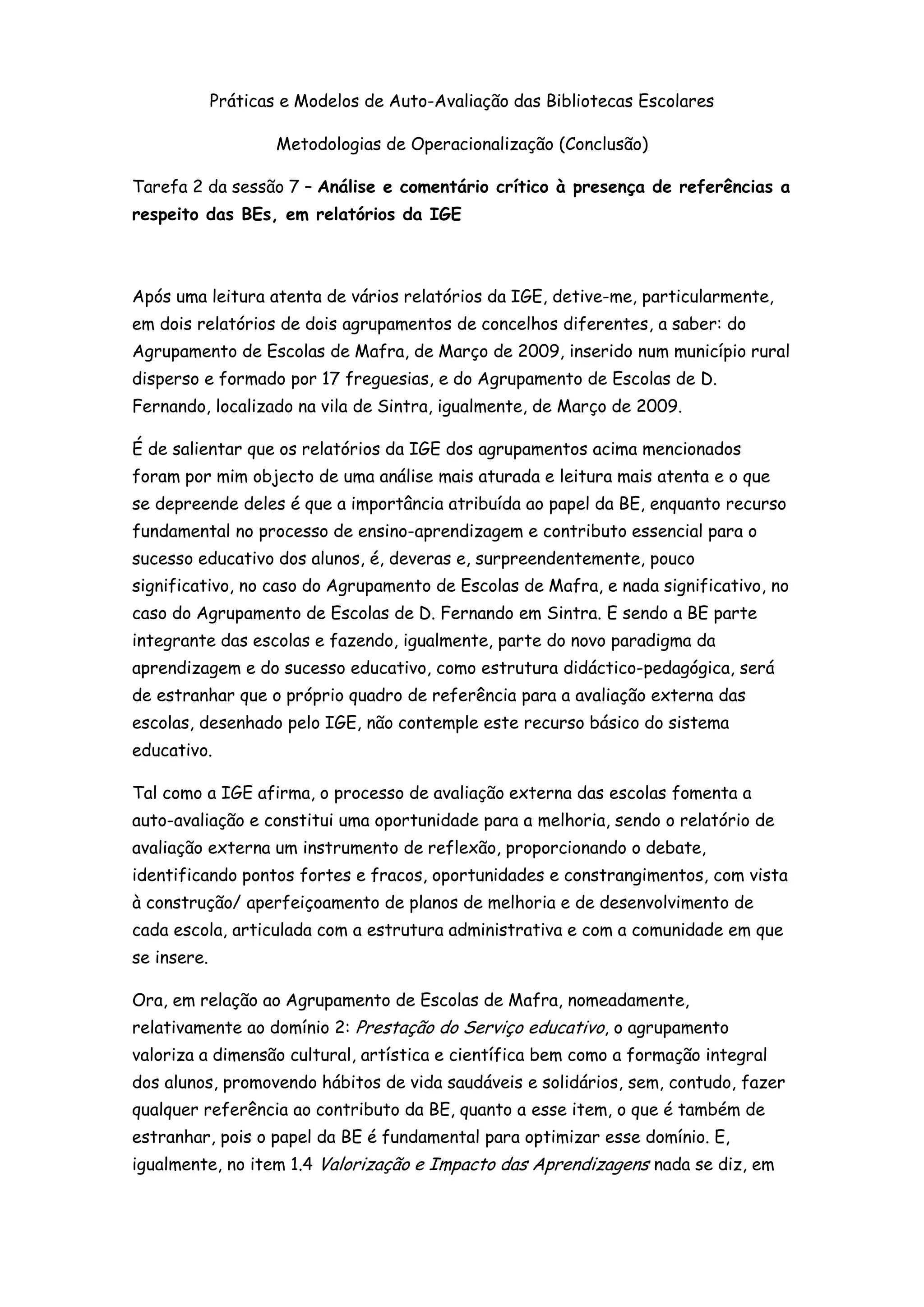 Este documento analisa relatórios de avaliação externa de dois agrupamentos escolares portugueses realizados pelo IGE. O autor observa que os relatórios dão pouca ou nenhuma importância ao papel das bibliotecas escolares, apesar destas serem recursos essenciais para o sucesso educativo. As bibliotecas deveriam ser reconhecidas como áreas fundamentais de intervenção para a melhoria contínua das escolas.